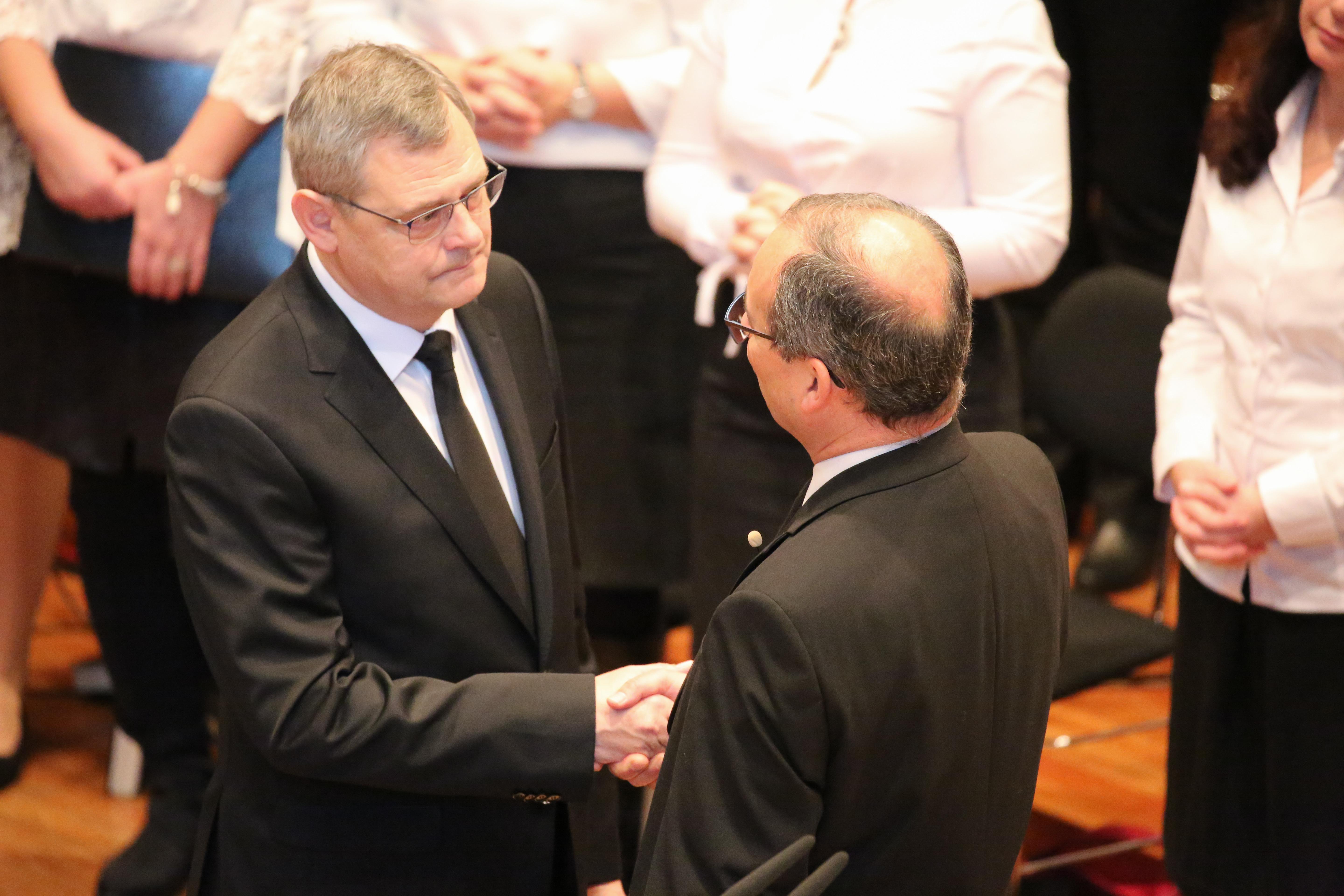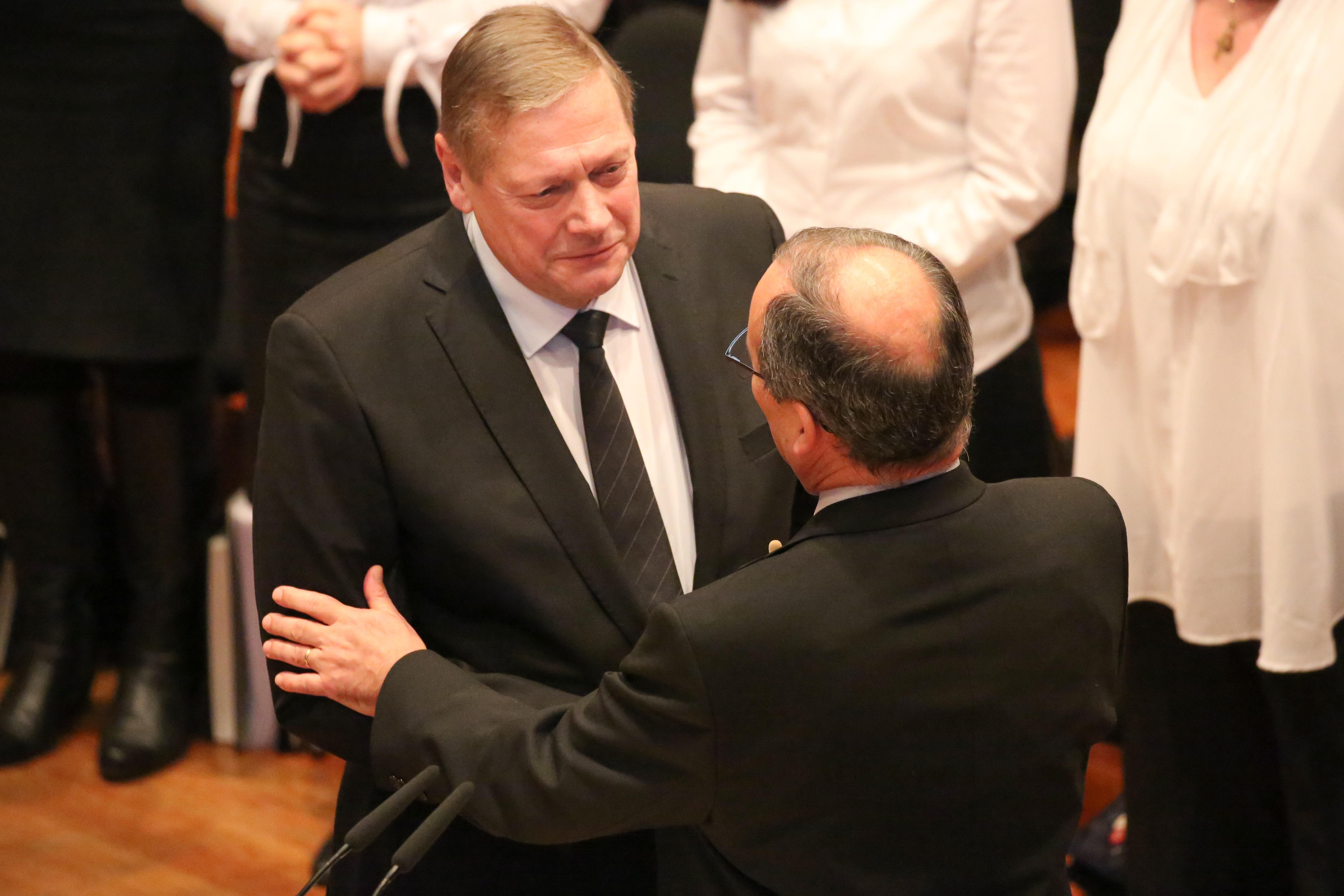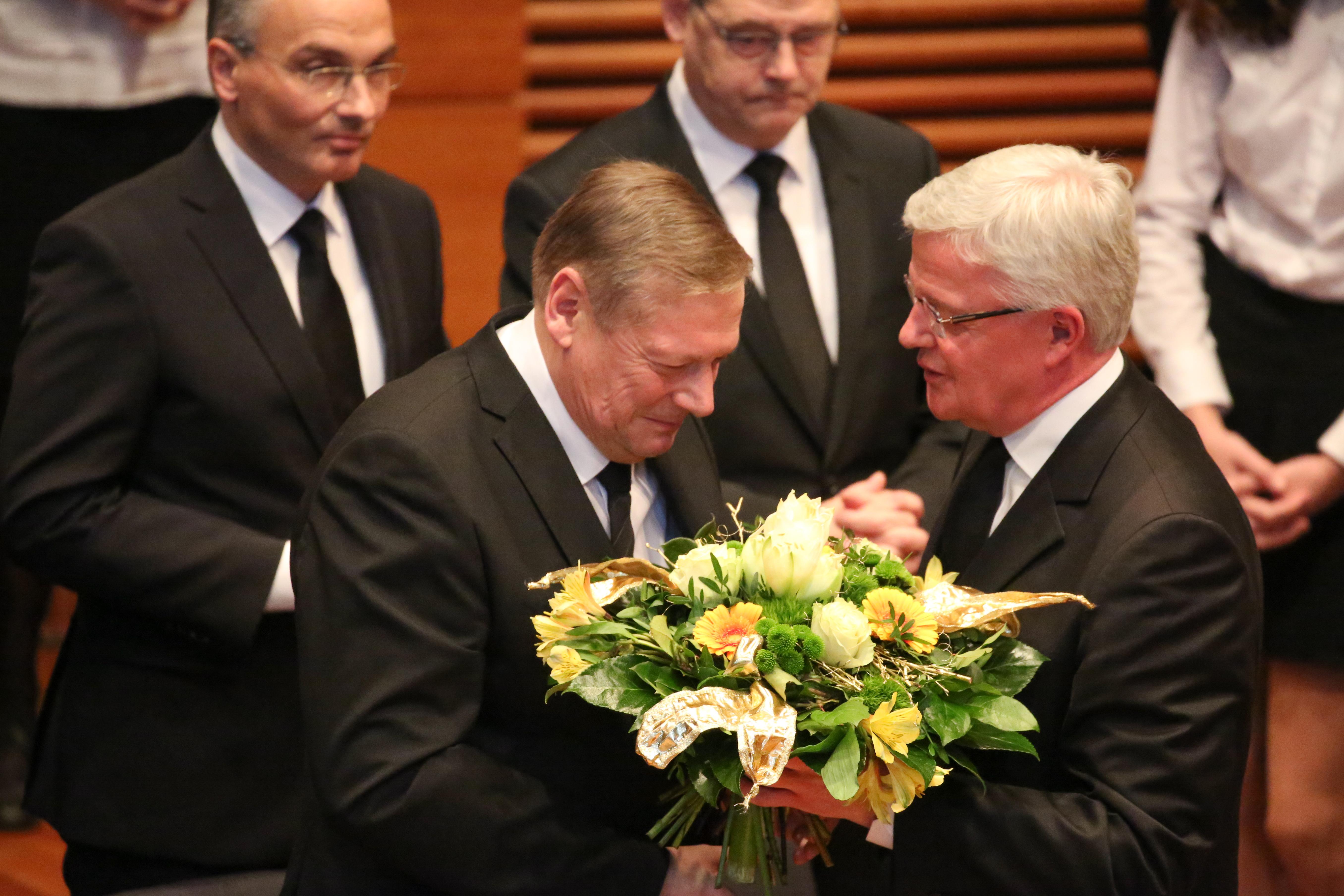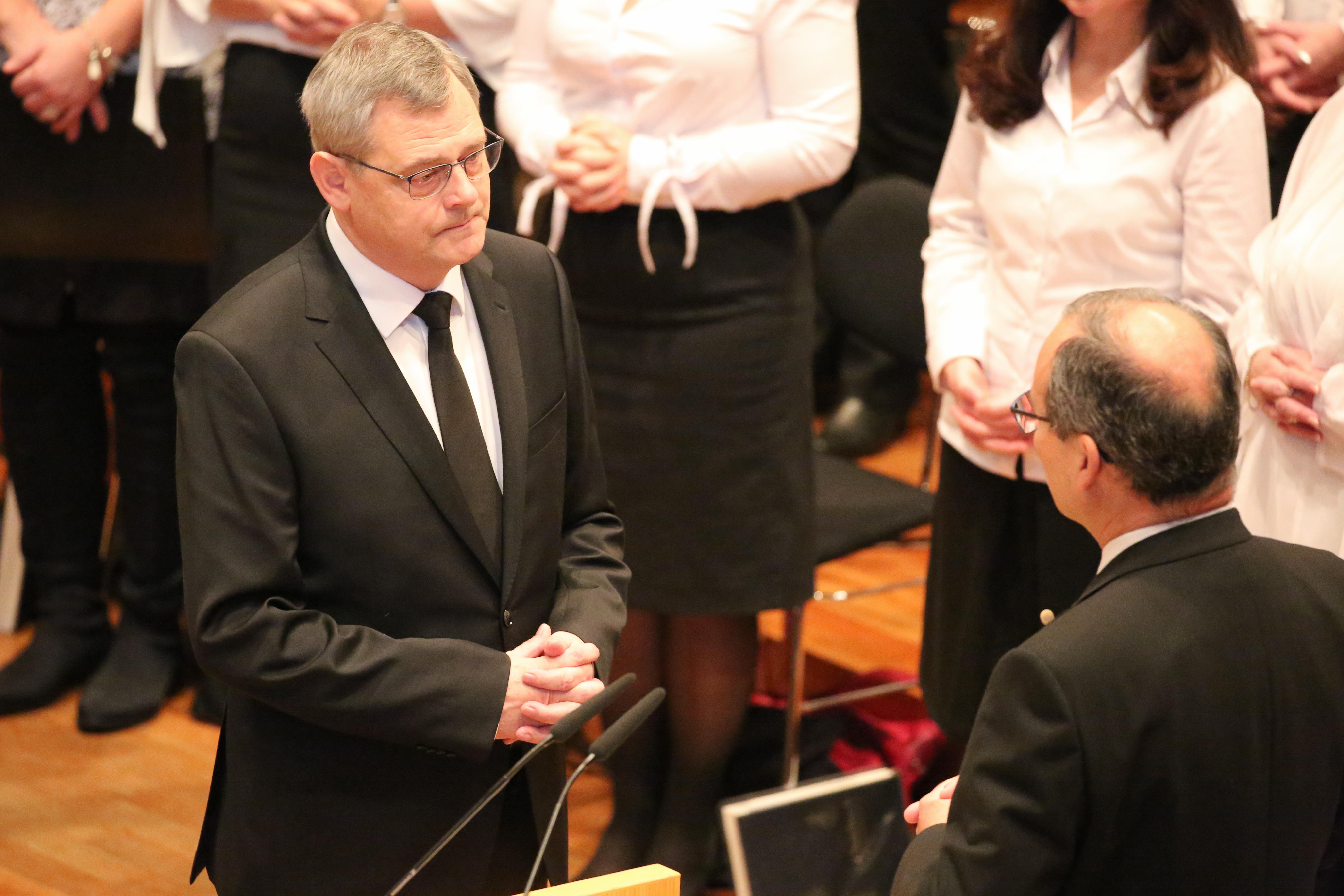 Nach der Feier des Heiligen Abendmahls folgte die Verabschiedung von Apostel Rolf Wosnitzka in den Ruhestand. „Danke, dass du dein Leben in den Dienst des Herrn gestellt hast“, bedankte sich Stammapostel Schneider für seine 15-jährige Tätigkeit als Apostel. „Du hast deine Geschwister von ganzem Herzen geliebt und ihre Lasten geteilt.“