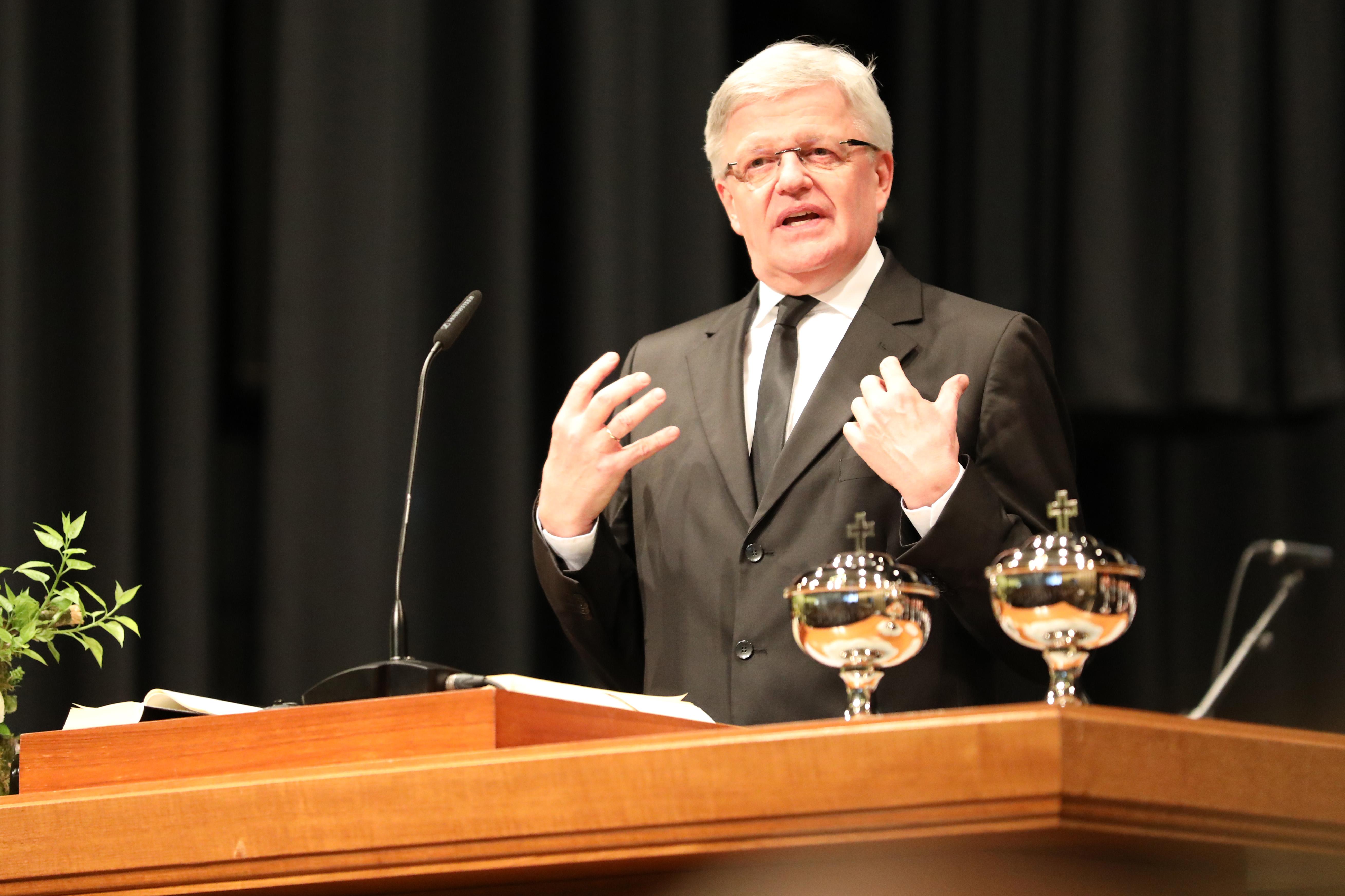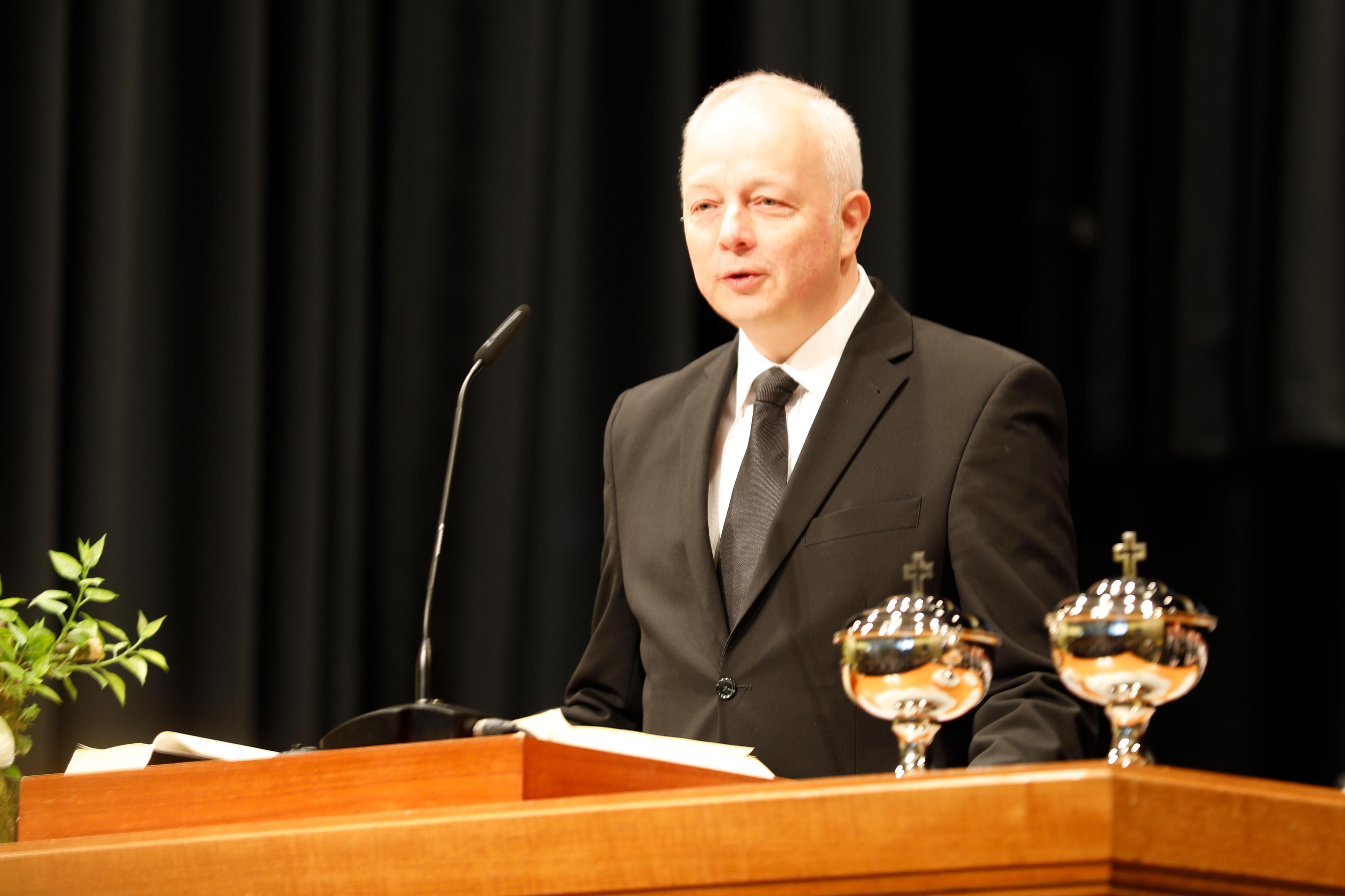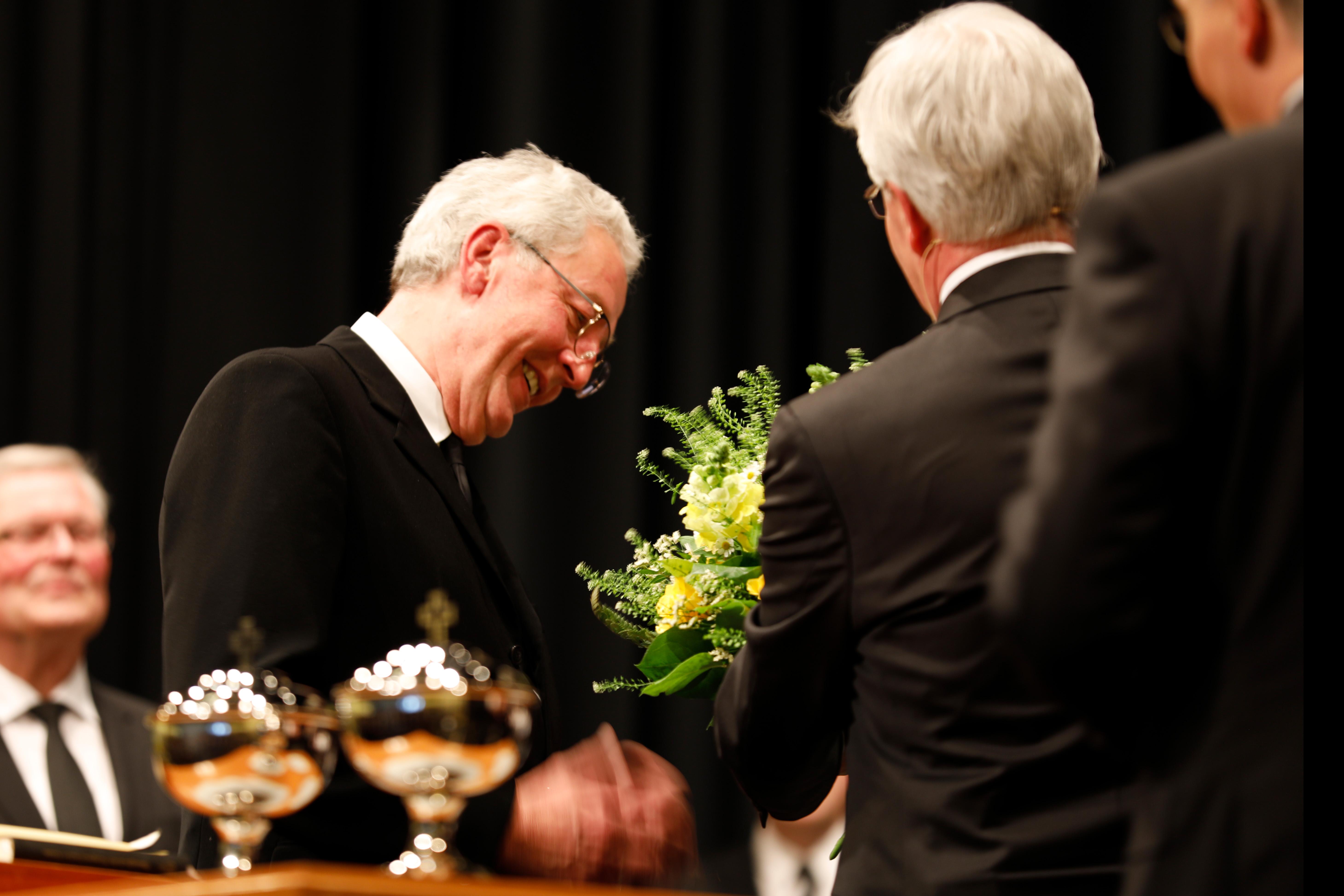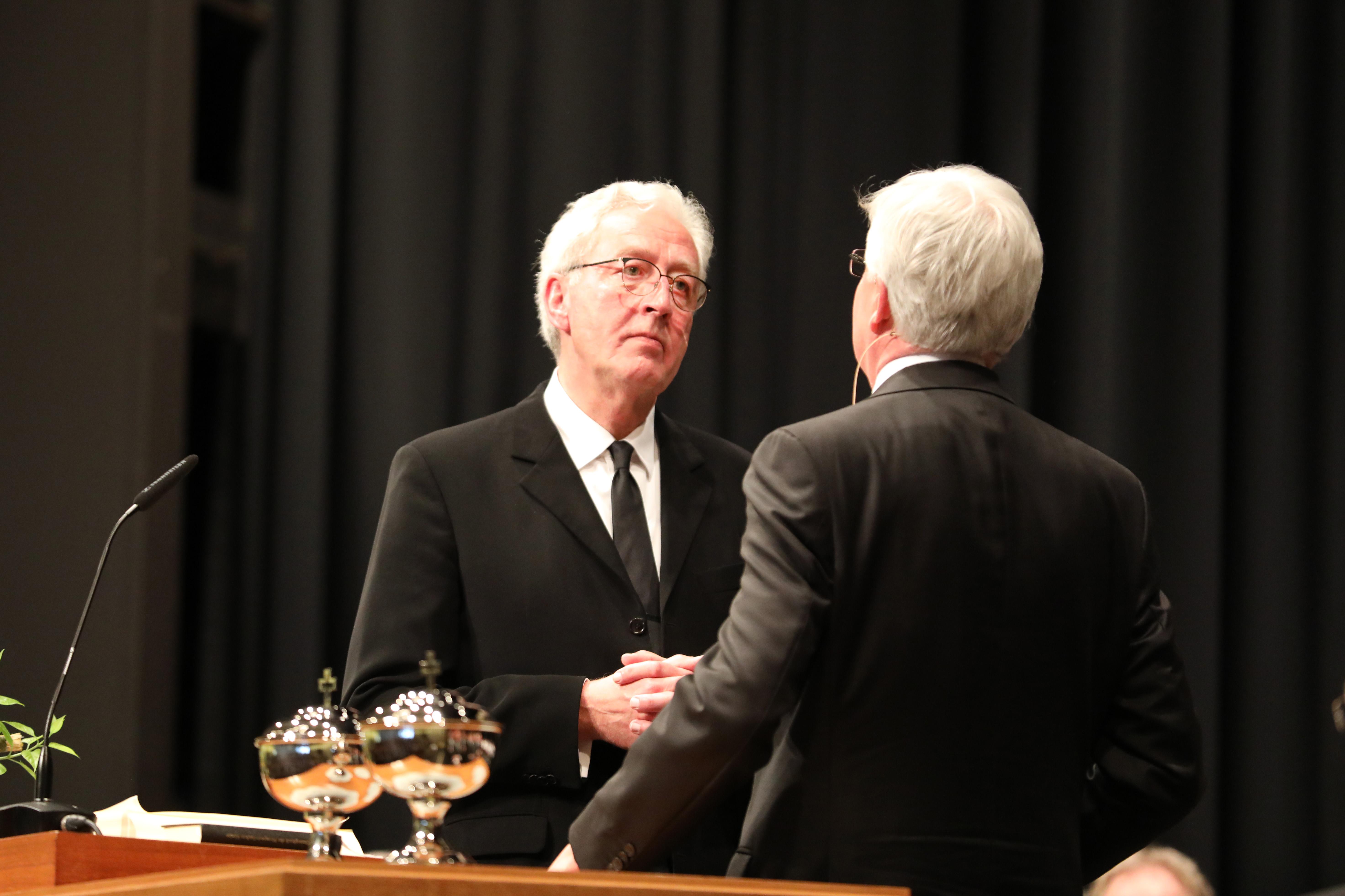 „Das ist nicht nur für dich, sondern für uns alle ein besonderer Augenblick“, leitete Bezirksapostel Krause die Ruhesetzung von Bischof Hartwig ein. „Wir danken dir, dass du dich mit deinen Gaben, mit deinen Kräften, mit deinem ganzen Herzen eingebracht hast und für uns alle gearbeitet hast“, würdigte Bezirksapostel Krause die Mitarbeit des Bischofs: „Du warst uns ein großartiger Begleiter.“ Besonders wertschätzend hob er dabei seine klare Ausrichtung zur Lehre und sein Gottvertrauen hervor. Seinen Dank richtete er auch an die Familie von Bischof Hartwig, die ihn bei jeder Entscheidung unterstütze.