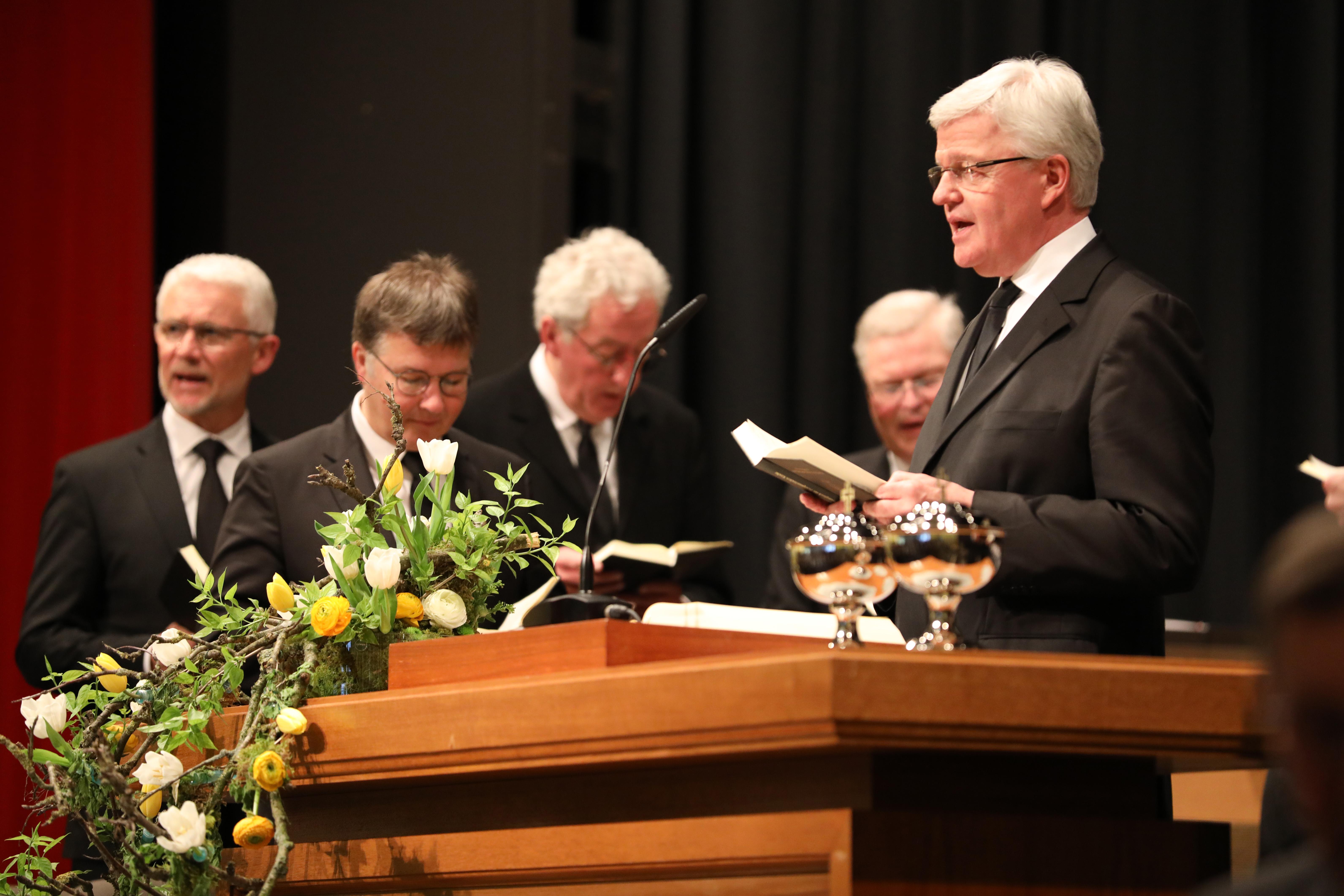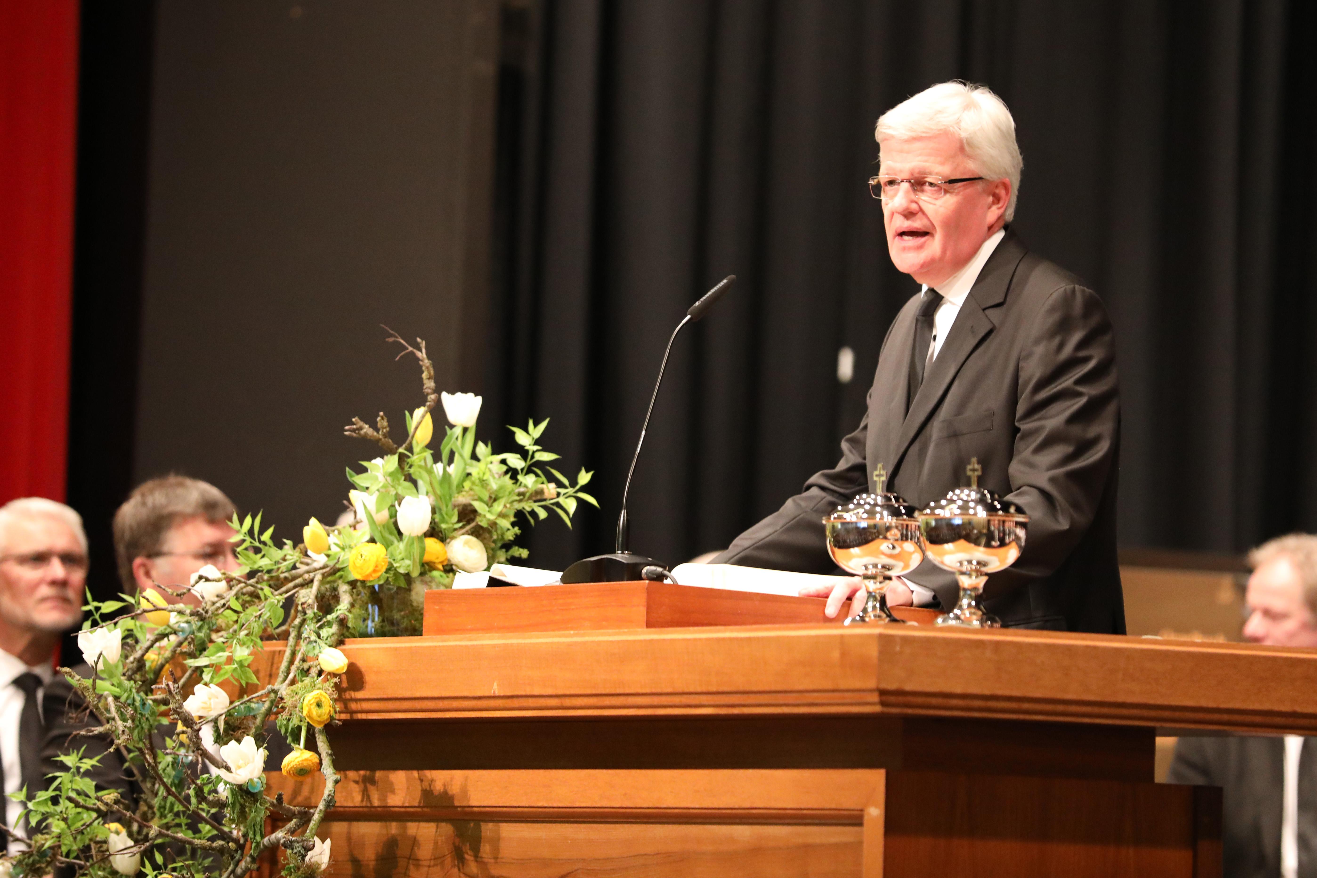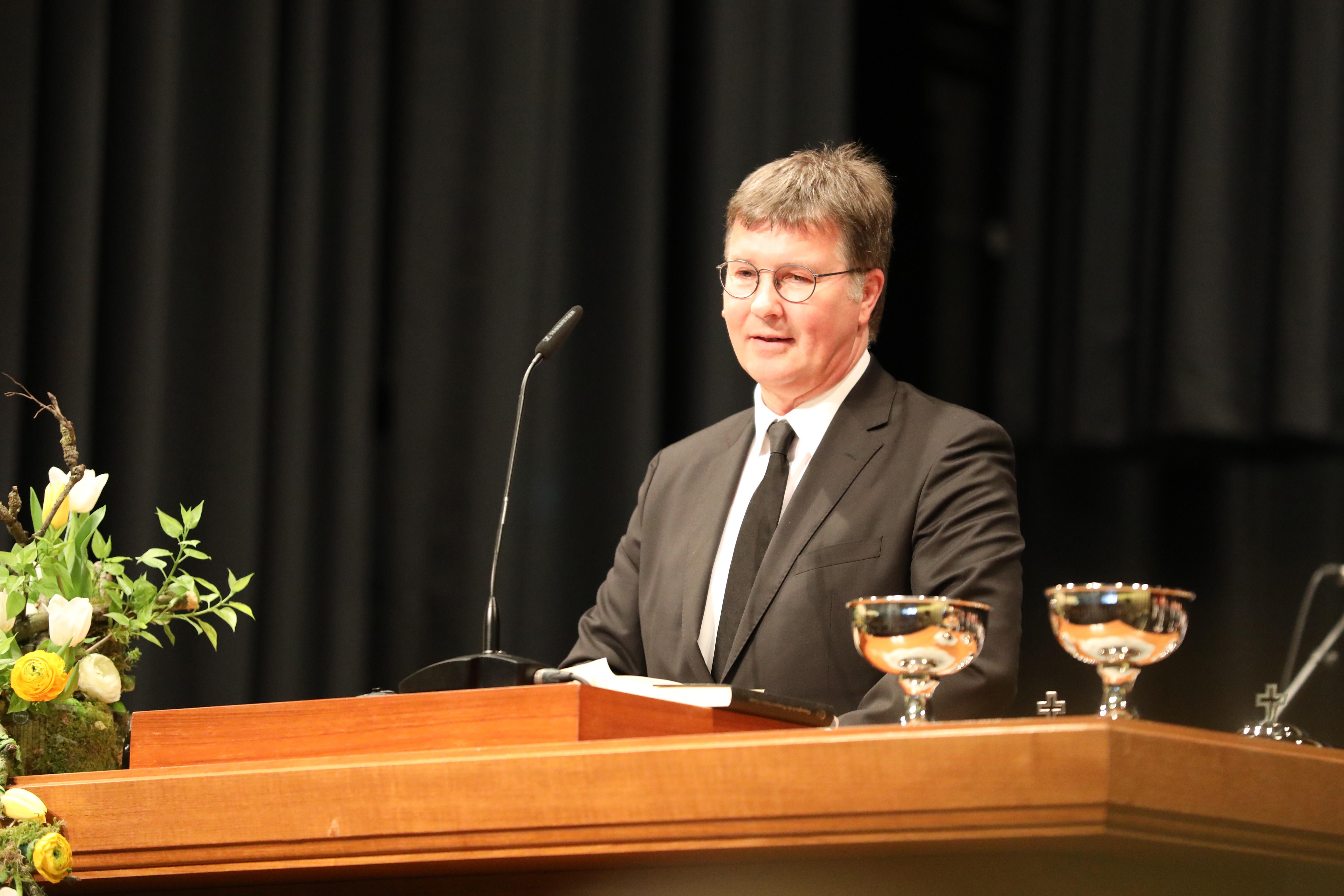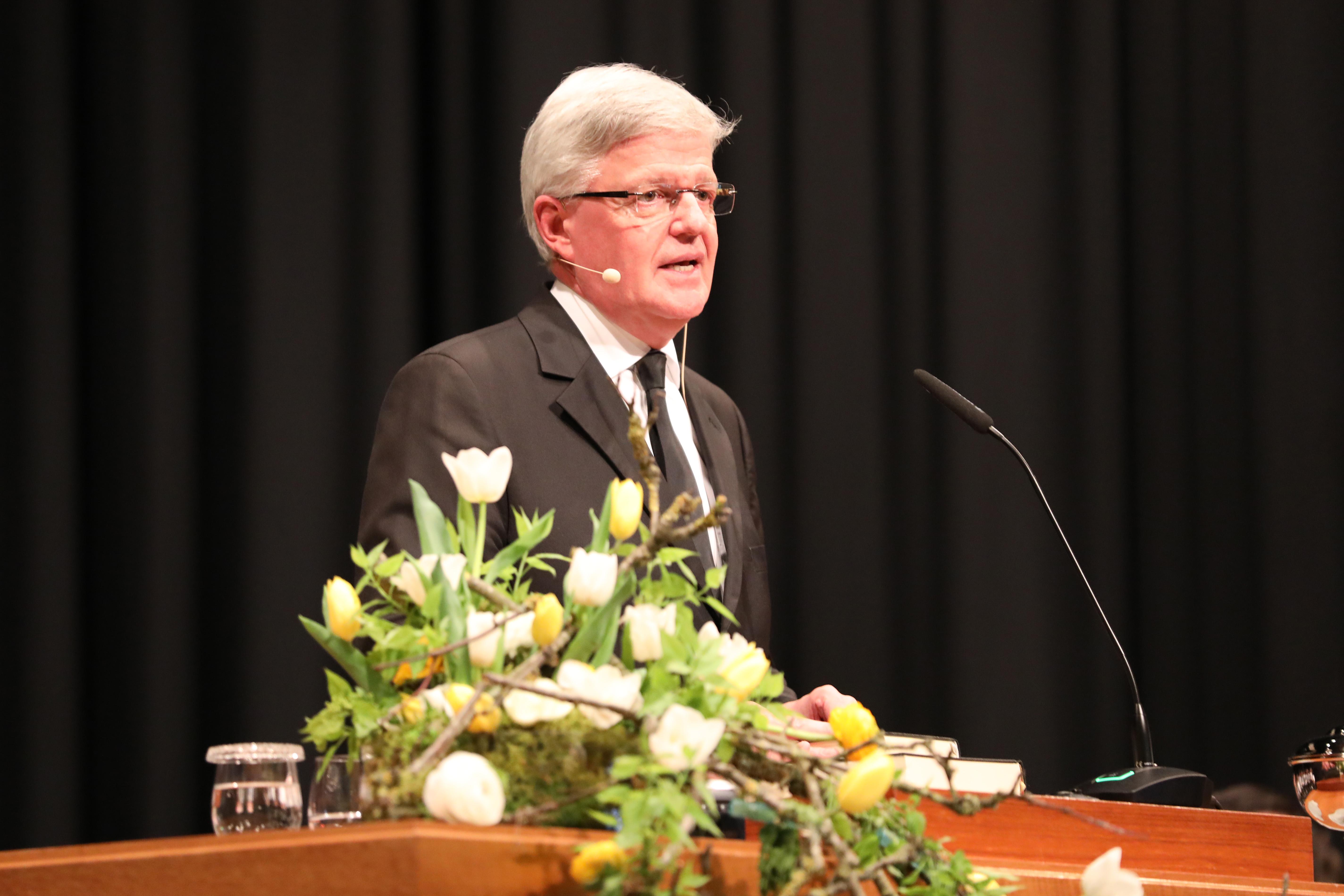 „Das ist nicht nur für dich, sondern für uns alle ein besonderer Augenblick“, leitete Bezirksapostel Krause die Ruhesetzung von Bischof Hartwig ein. „Wir danken dir, dass du dich mit deinen Gaben, mit deinen Kräften, mit deinem ganzen Herzen eingebracht hast und für uns alle gearbeitet hast“, würdigte Bezirksapostel Krause die Mitarbeit des Bischofs: „Du warst uns ein großartiger Begleiter.“ Besonders wertschätzend hob er dabei seine klare Ausrichtung zur Lehre und sein Gottvertrauen hervor. Seinen Dank richtete er auch an die Familie von Bischof Hartwig, die ihn bei jeder Entscheidung unterstütze.