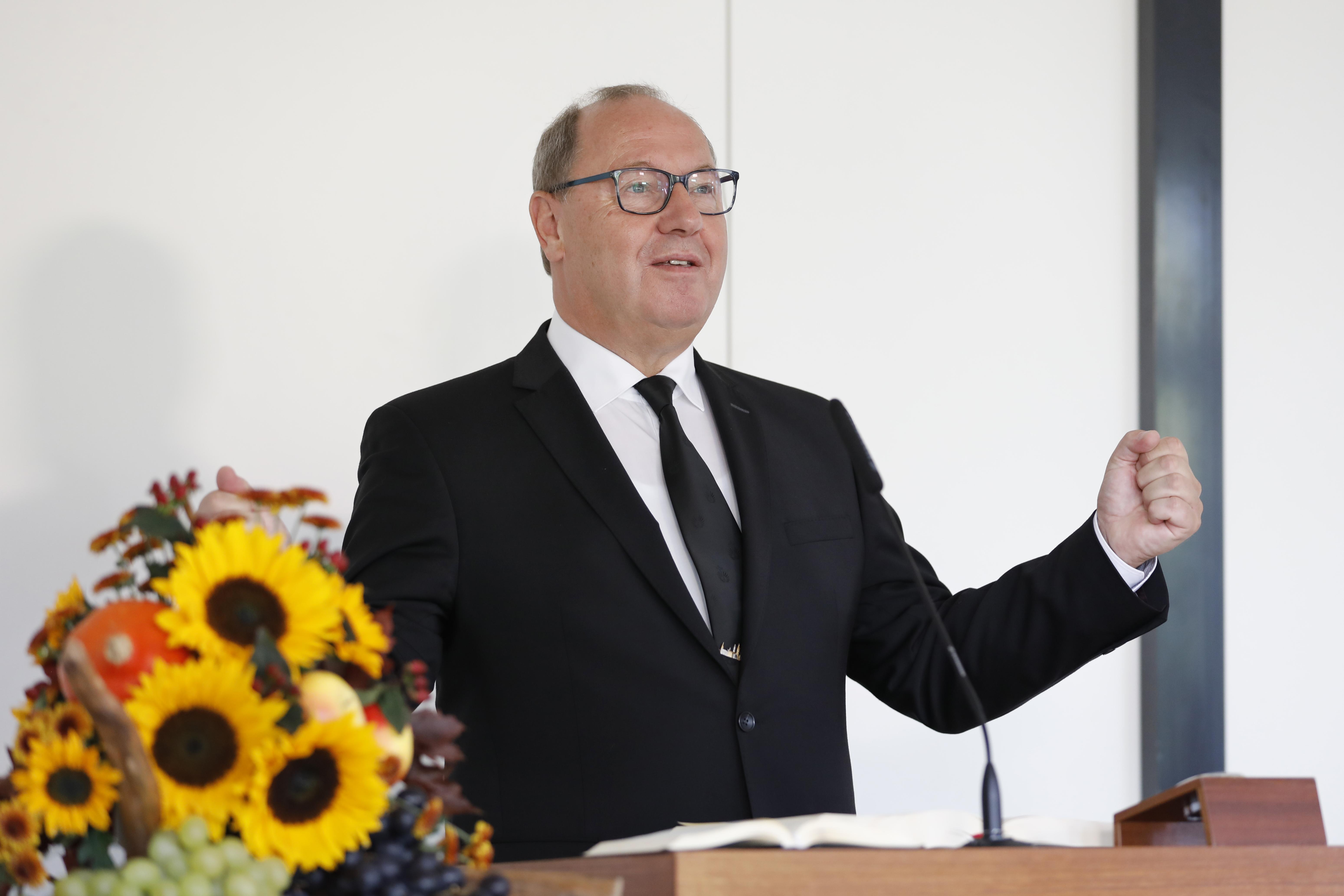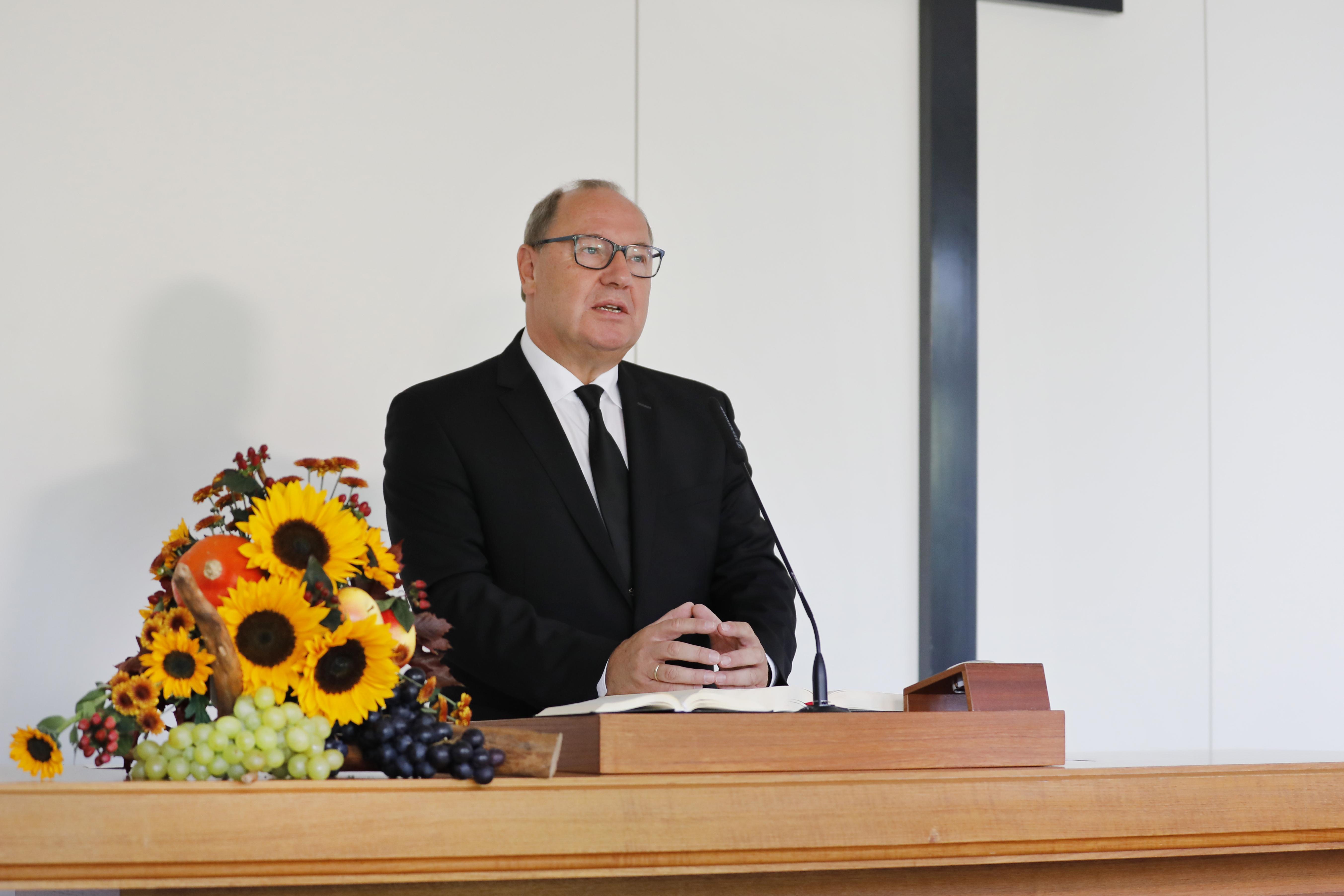 Direkt zu Beginn des Gottesdienstes zum Erntedanktag, stellte Bezirksältester Grasshoff den Schöpfungsakt Gottes heraus, „Alles begann mit zwei Worten: ‚Es werde‘“, und brachte Lob und Dank für die Schöpfung Gottes zum Ausdruck: „Aus Chaos hat Gott eine wunderbare Ordnung geschaffen – was für ein Wunder!“