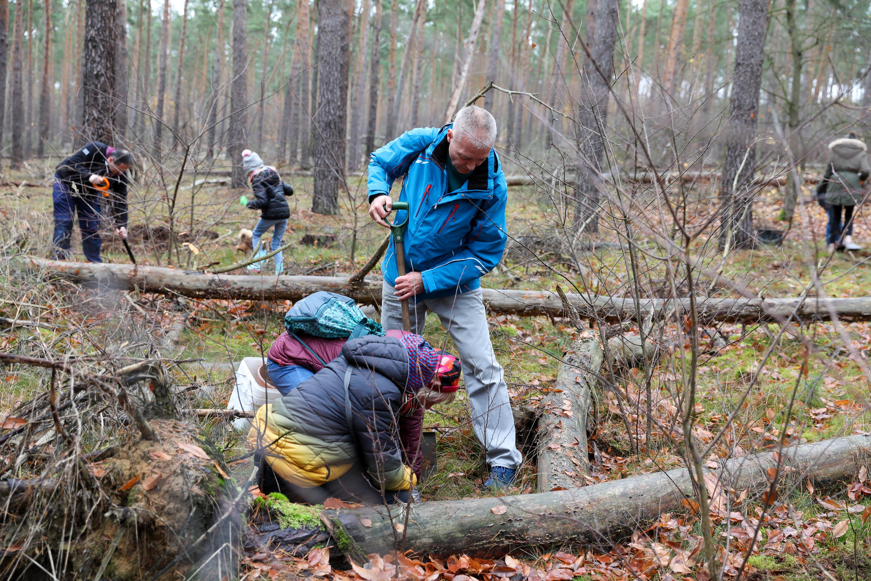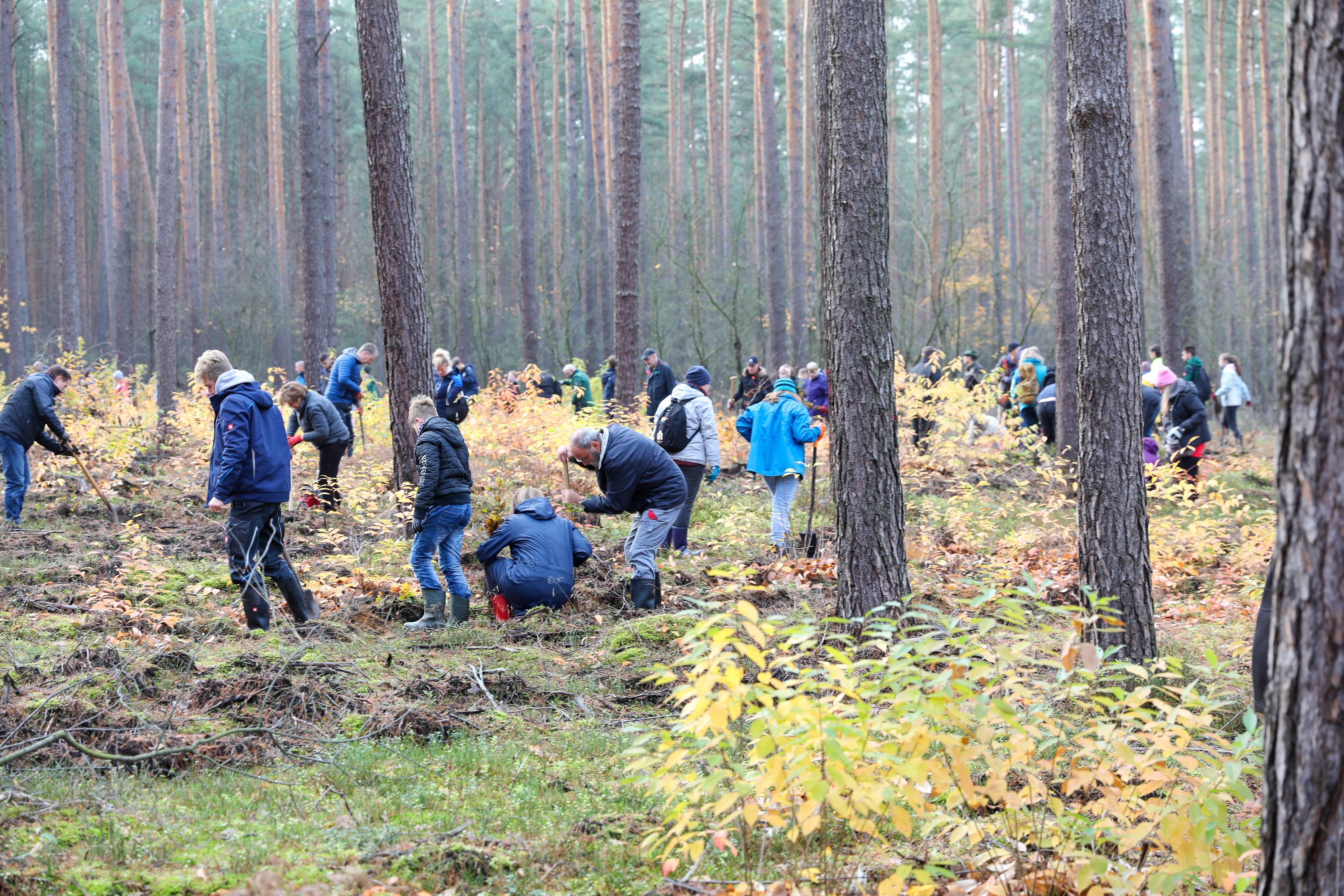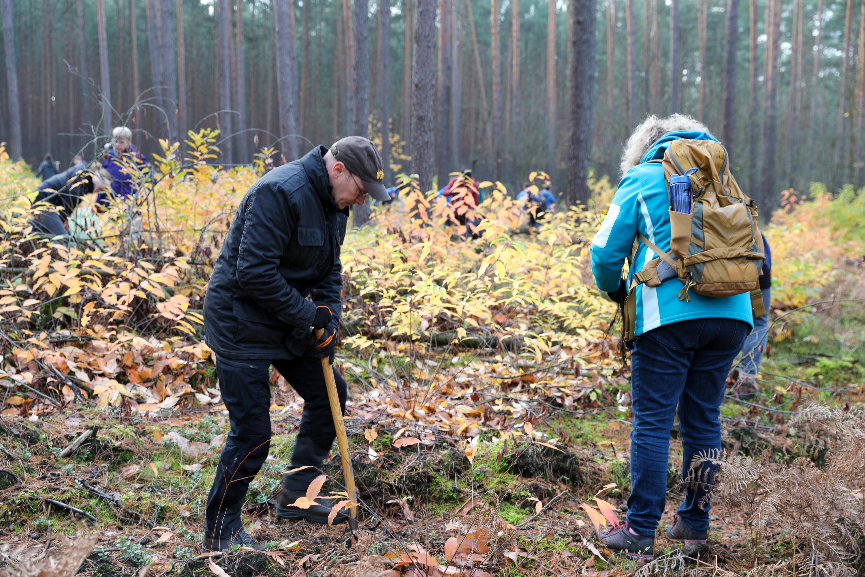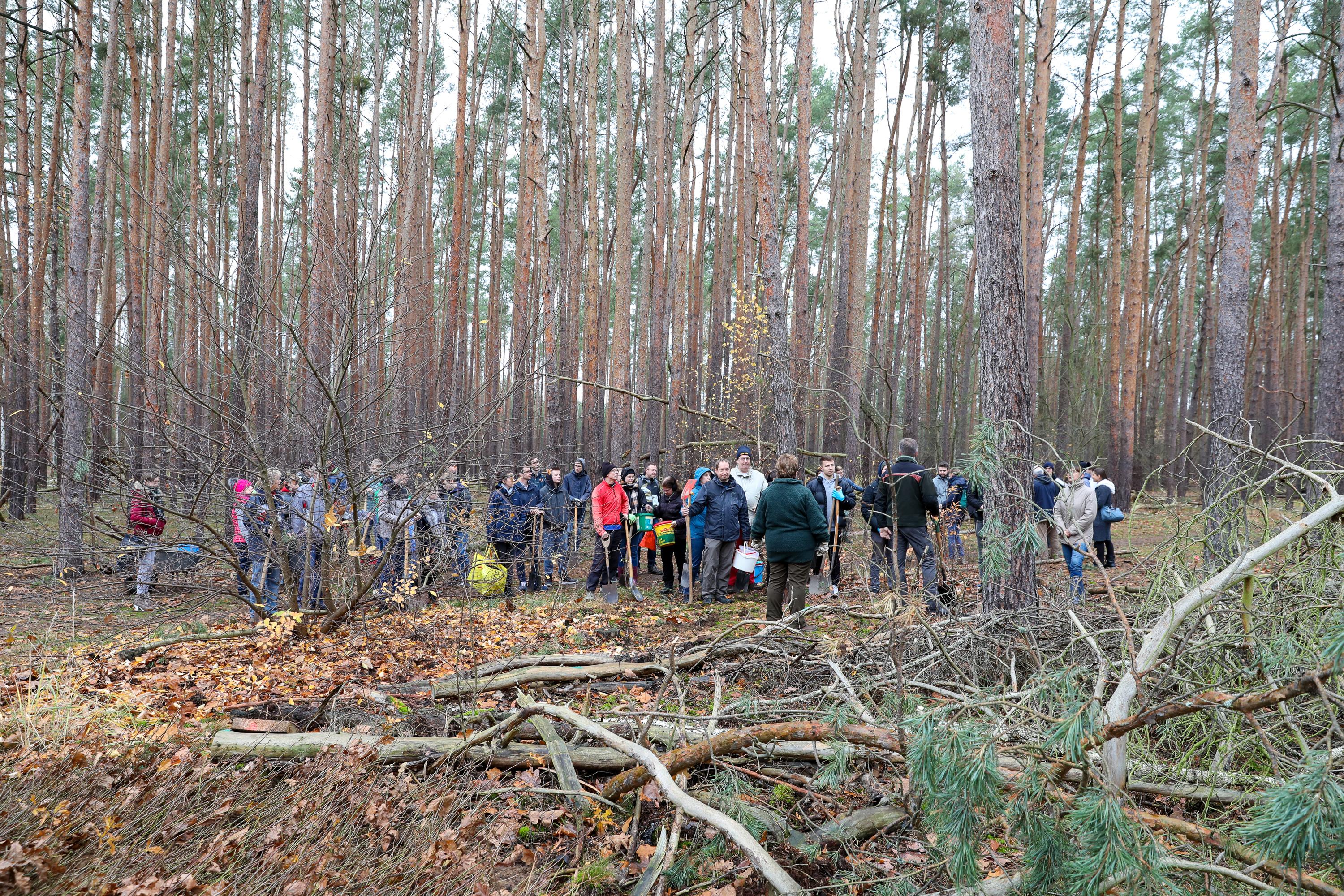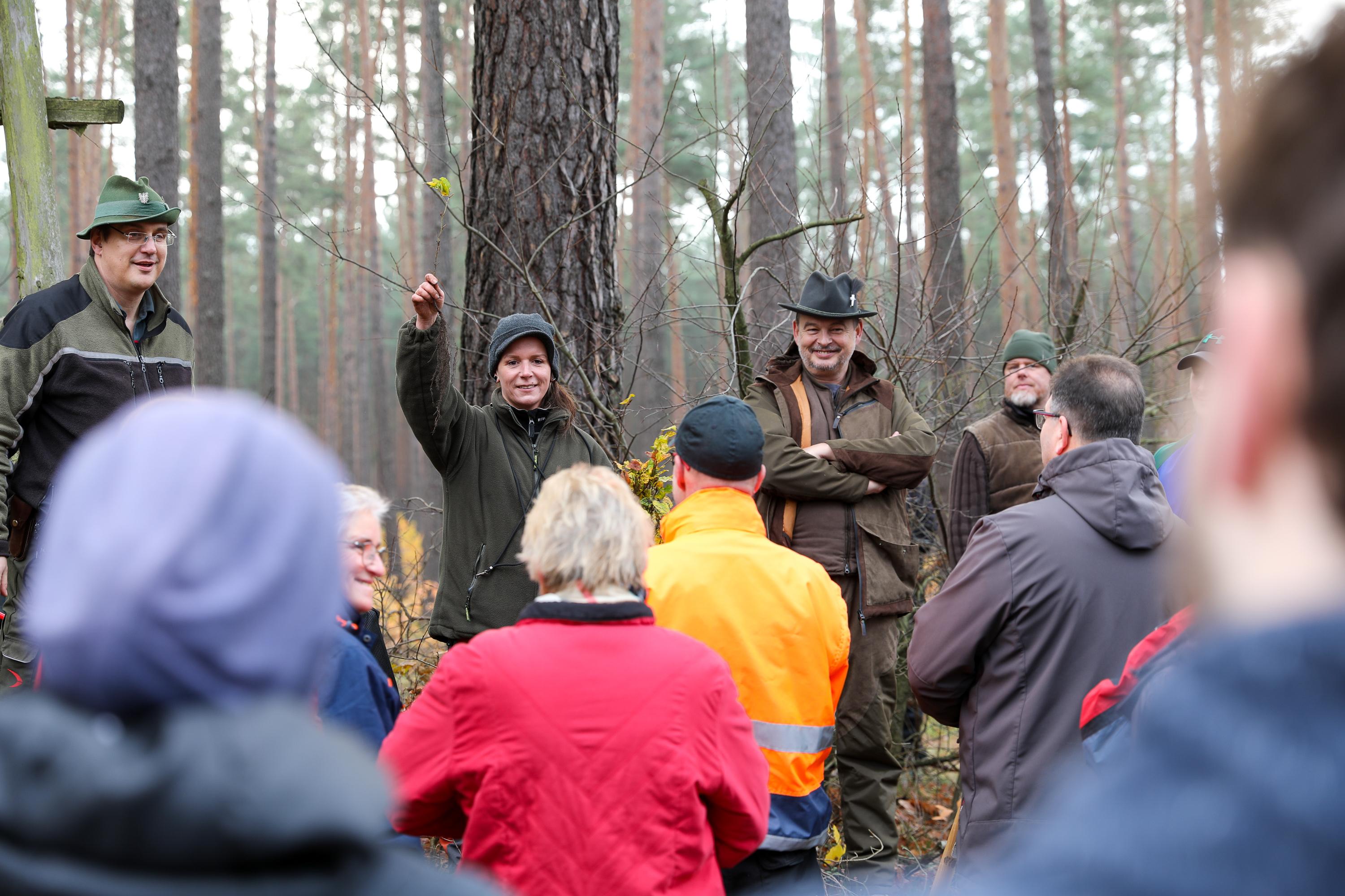 Die weiteren Novembertermine finden ganz überwiegend im Forst statt. Ob die Pflanzung von Traubeneichen im Landesbetrieb Brandenburg, Eichen und Douglasien in Forst, ob in Ludwigsfelde mitten im Wald oder als Pflanzung zwischen bestehenden Bäumen in Birkenwerder: Immer geht es darum, Diversität in den Wäldern zu fördern, die Monokulturen durch Pflanzungen in Mischwälder zu wandeln. So auch bei der Schutzgemeinschaft Deutscher Wald, bei der mit etwa 200 Personen an einem Samstagmorgen 1.000 Flatterulmen mitten zwischen hohen Bäume gesetzt werden. Oder in Schwedt, wo Mitglieder der umliegenden Kirchengemeinden eine durch den Borkenkäfer und starken Windbruch entstandene Brache mit Douglasien aufforsten. Einer Baumart, die nicht unbedingt für diversen Wald steht, die aber in der kargen, sandigen Gegend gut geeignet ist, wie der begleitende Förster den erstaunten Waldgästen erklärt.