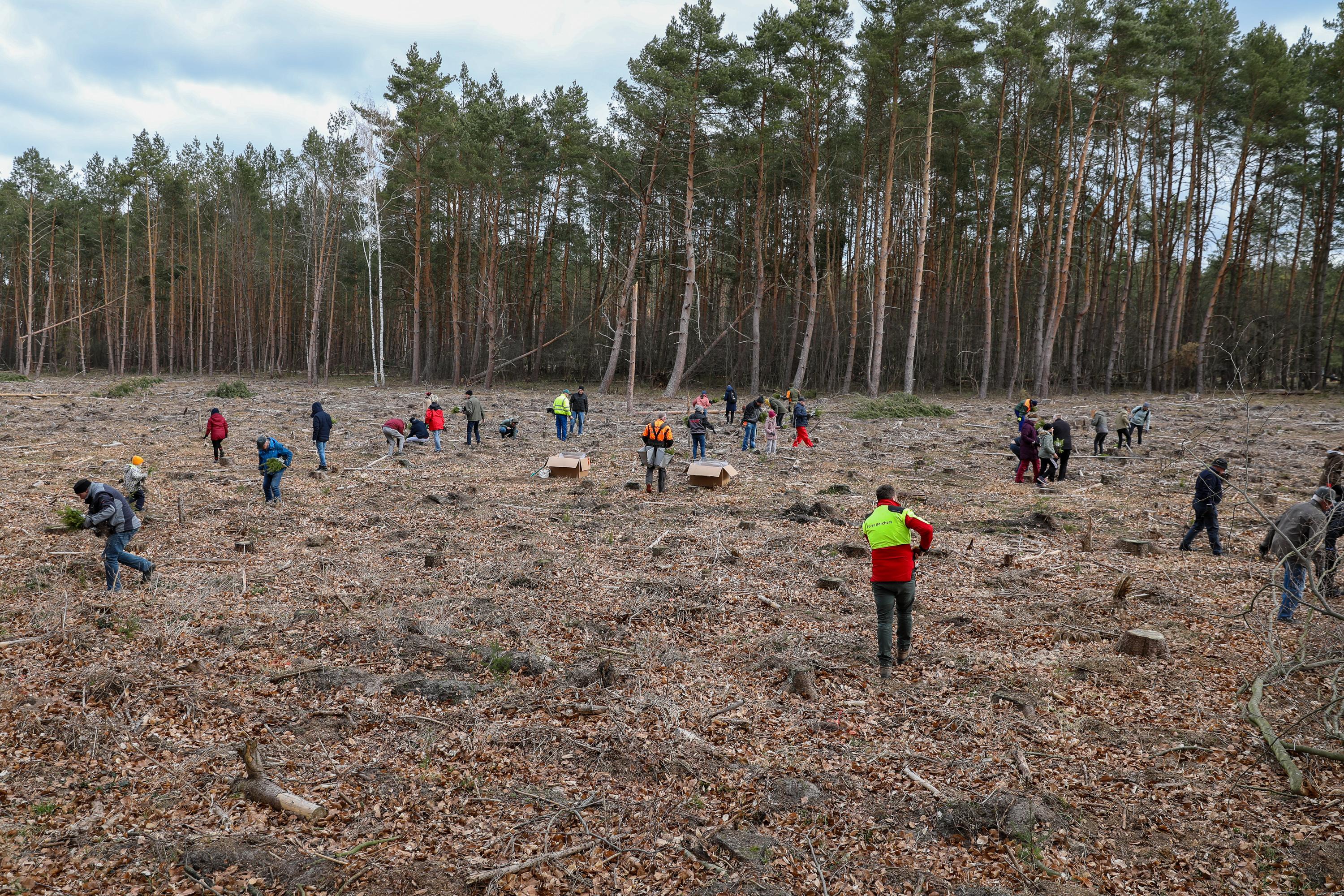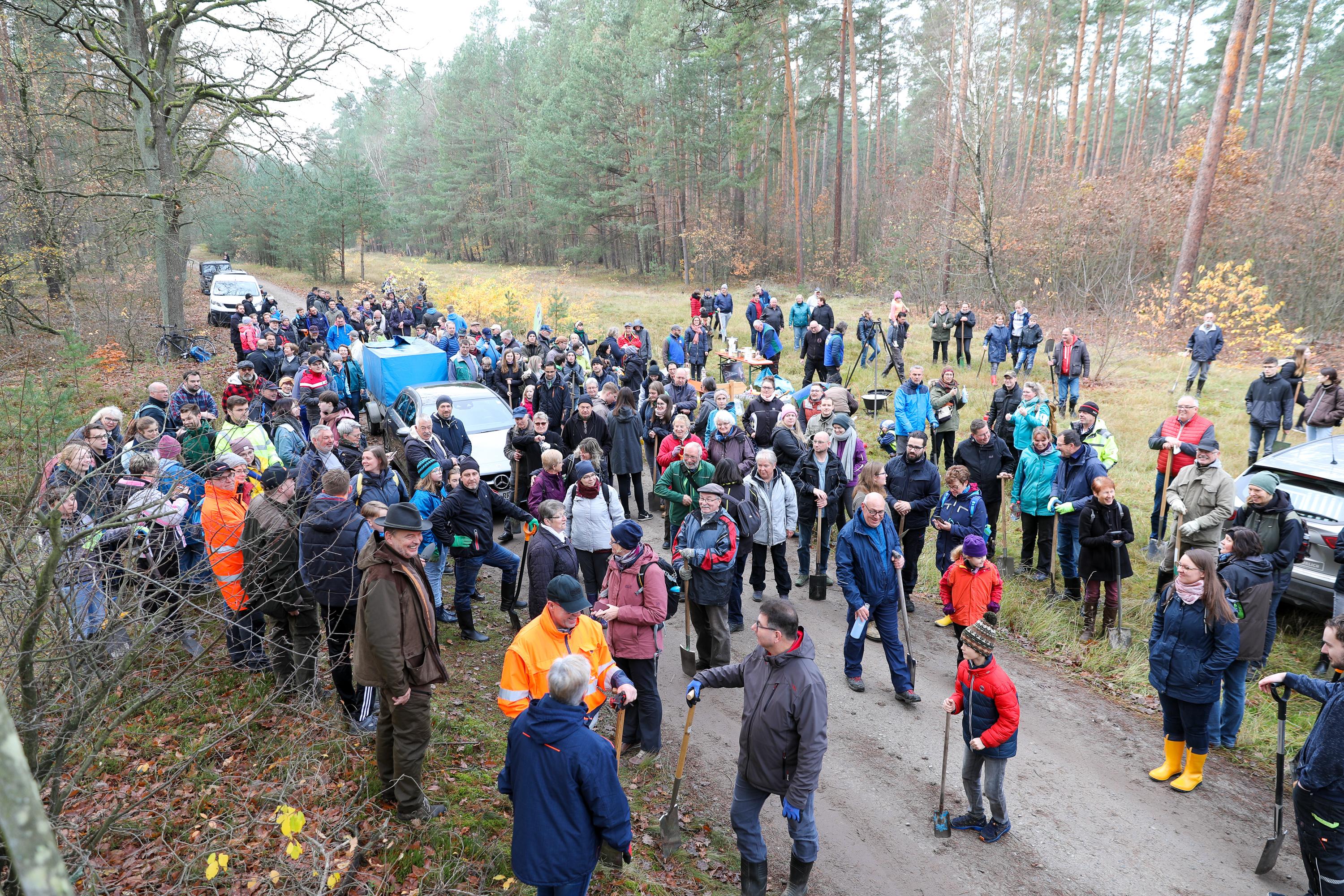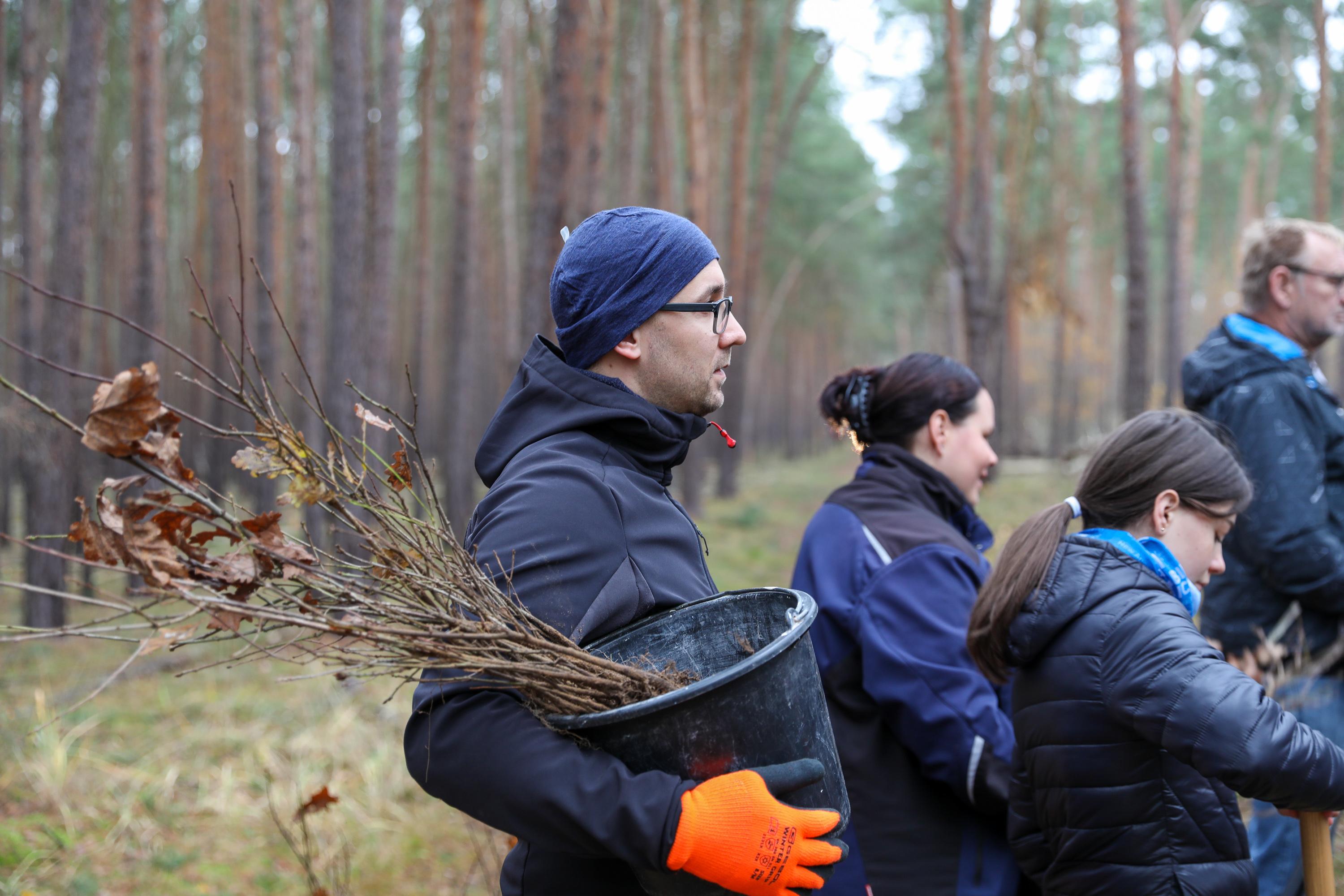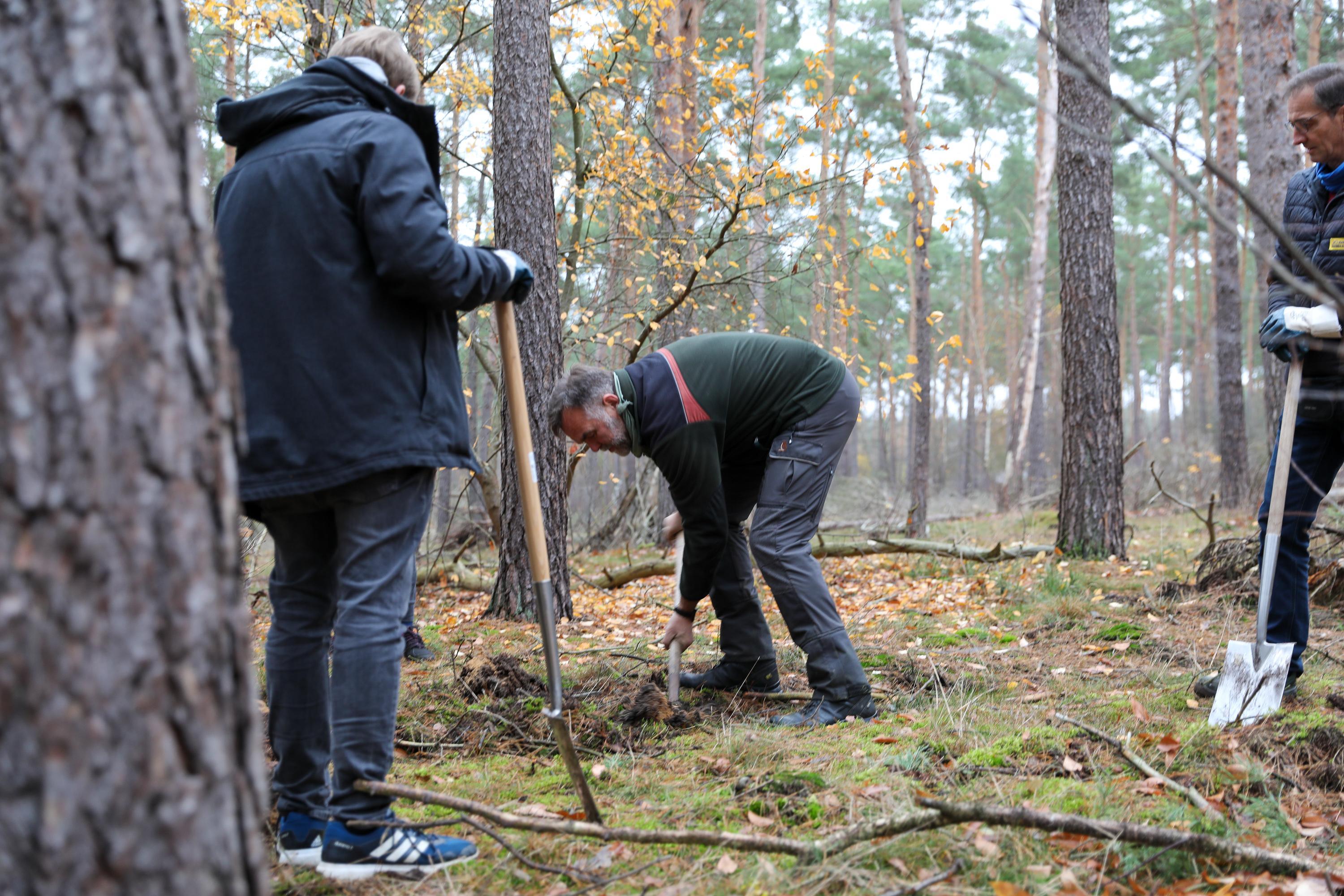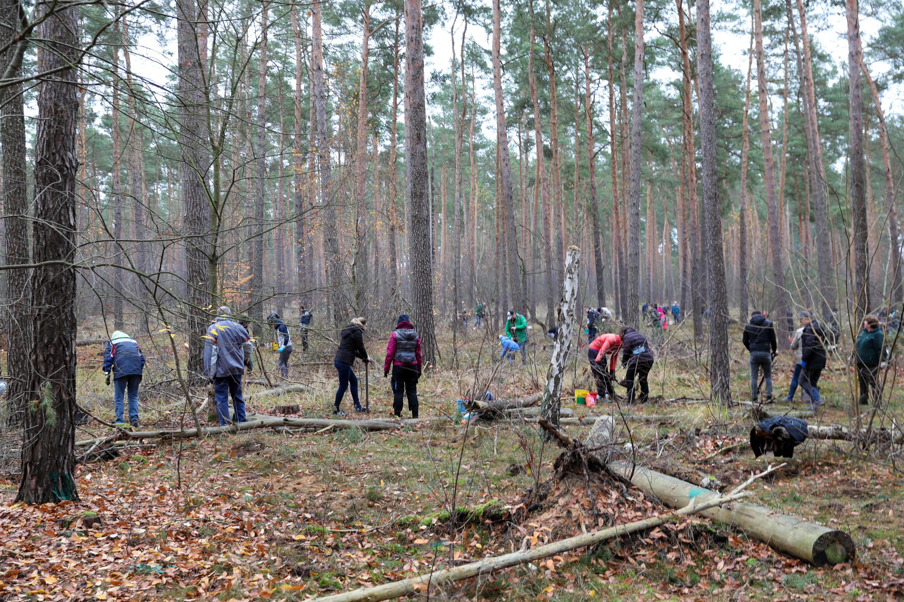 Die weiteren Novembertermine finden ganz überwiegend im Forst statt. Ob die Pflanzung von Traubeneichen im Landesbetrieb Brandenburg, Eichen und Douglasien in Forst, ob in Ludwigsfelde mitten im Wald oder als Pflanzung zwischen bestehenden Bäumen in Birkenwerder: Immer geht es darum, Diversität in den Wäldern zu fördern, die Monokulturen durch Pflanzungen in Mischwälder zu wandeln. So auch bei der Schutzgemeinschaft Deutscher Wald, bei der mit etwa 200 Personen an einem Samstagmorgen 1.000 Flatterulmen mitten zwischen hohen Bäume gesetzt werden. Oder in Schwedt, wo Mitglieder der umliegenden Kirchengemeinden eine durch den Borkenkäfer und starken Windbruch entstandene Brache mit Douglasien aufforsten. Einer Baumart, die nicht unbedingt für diversen Wald steht, die aber in der kargen, sandigen Gegend gut geeignet ist, wie der begleitende Förster den erstaunten Waldgästen erklärt.