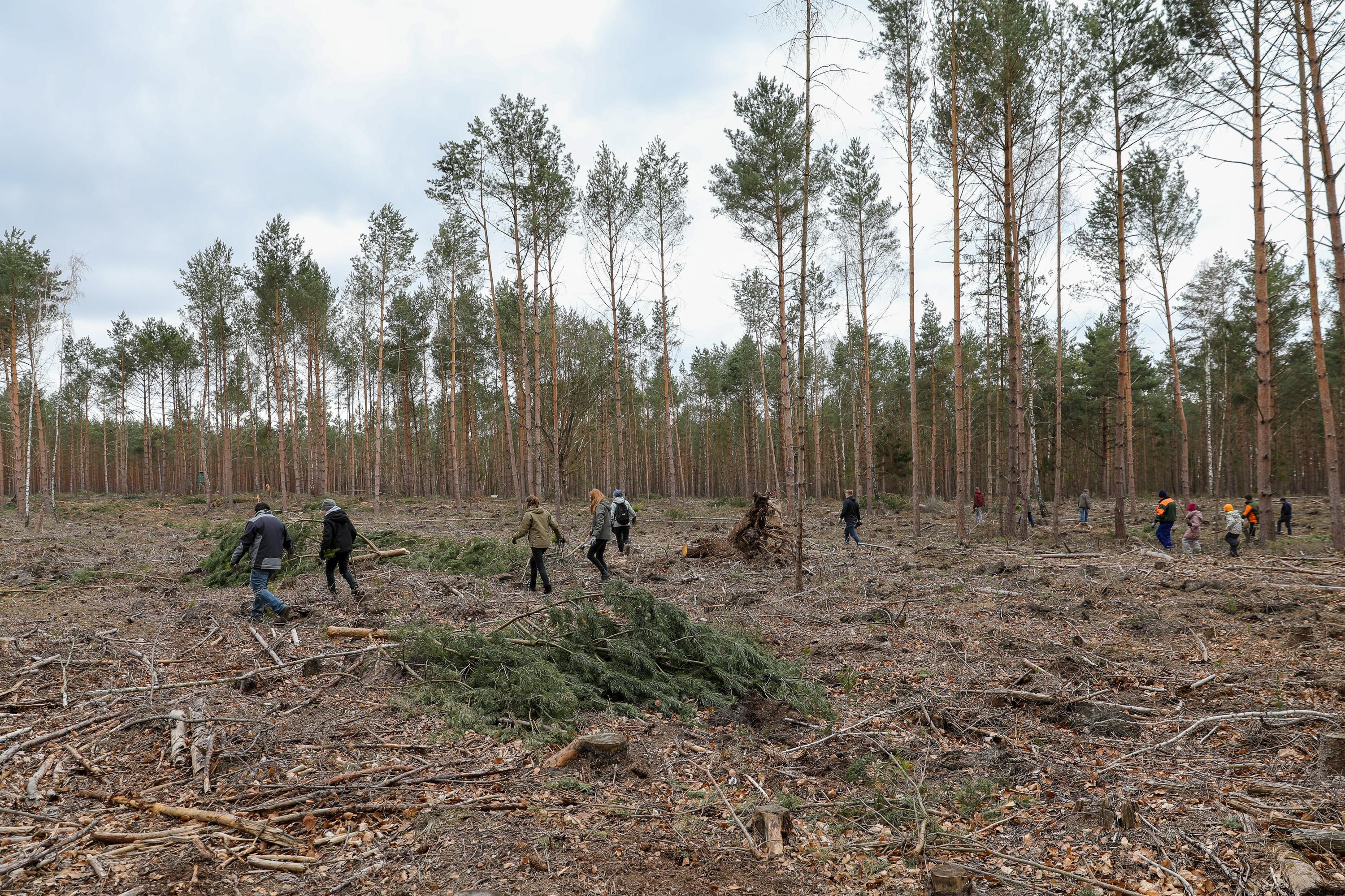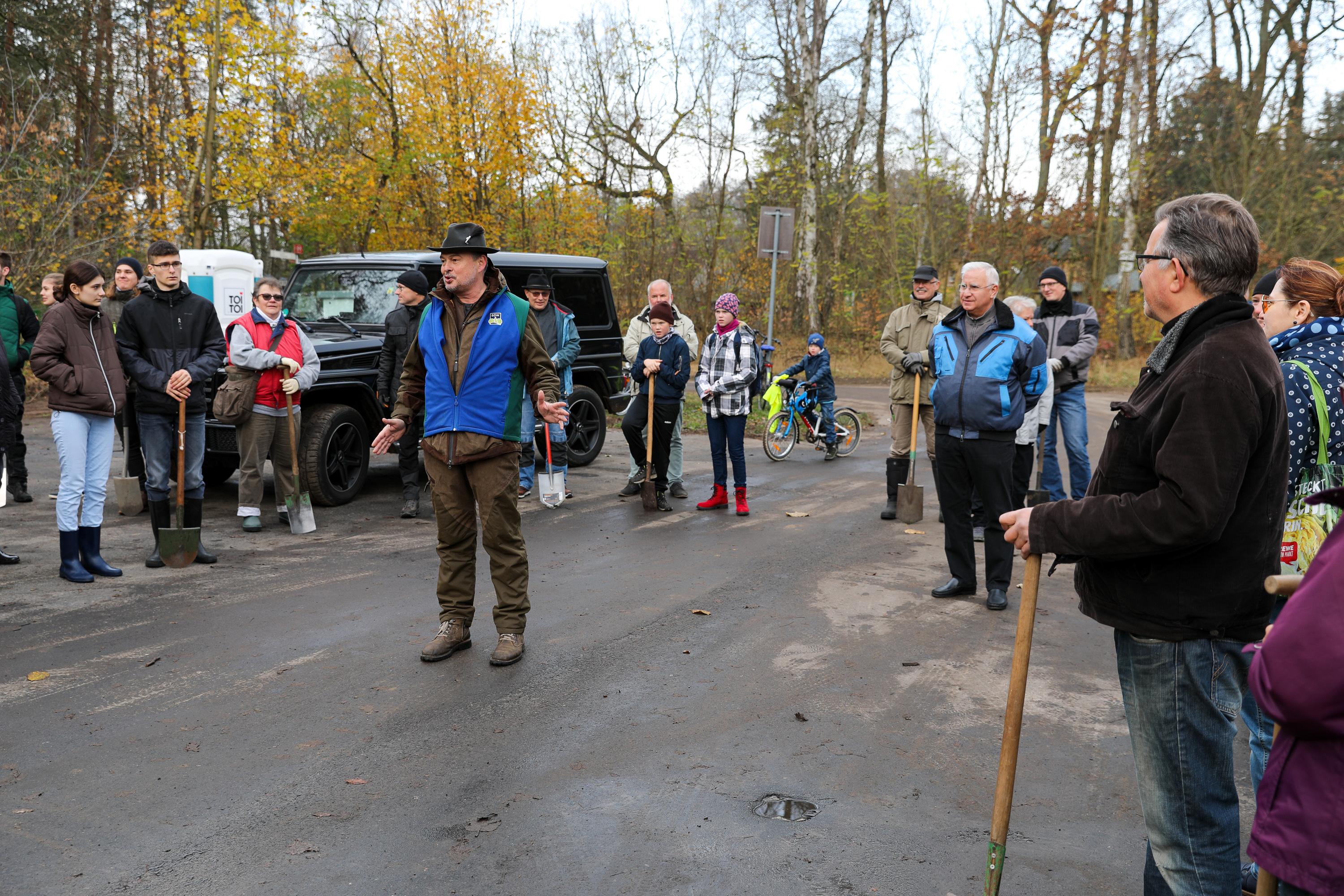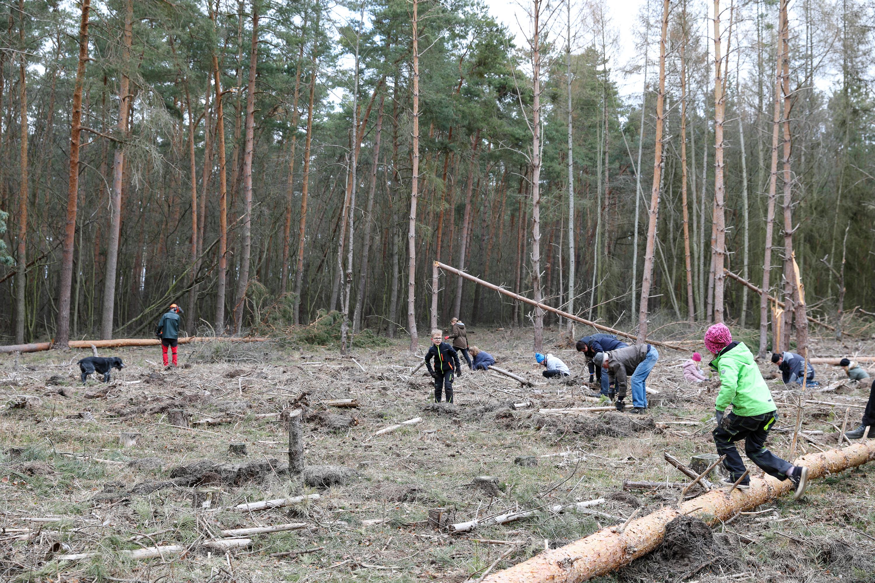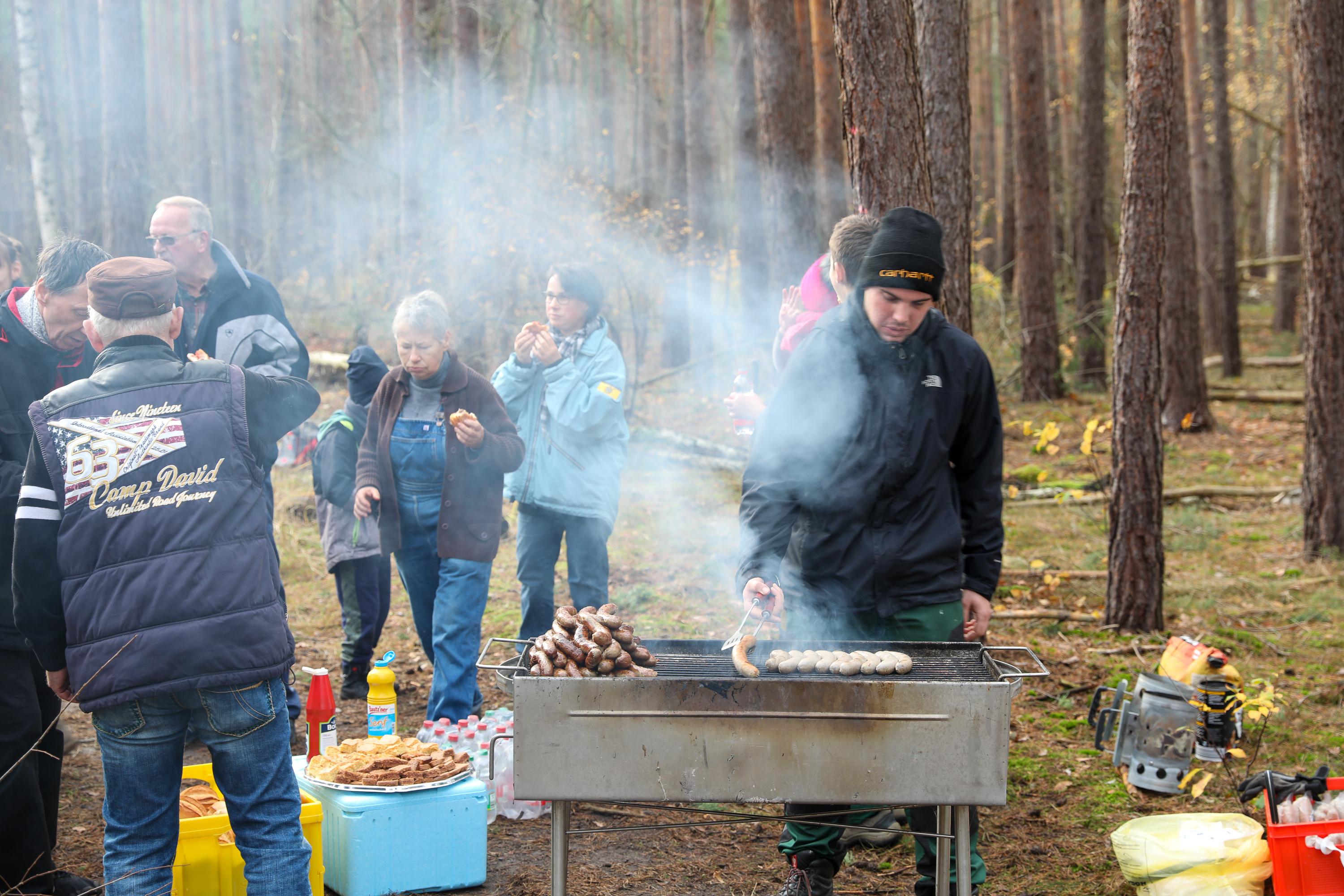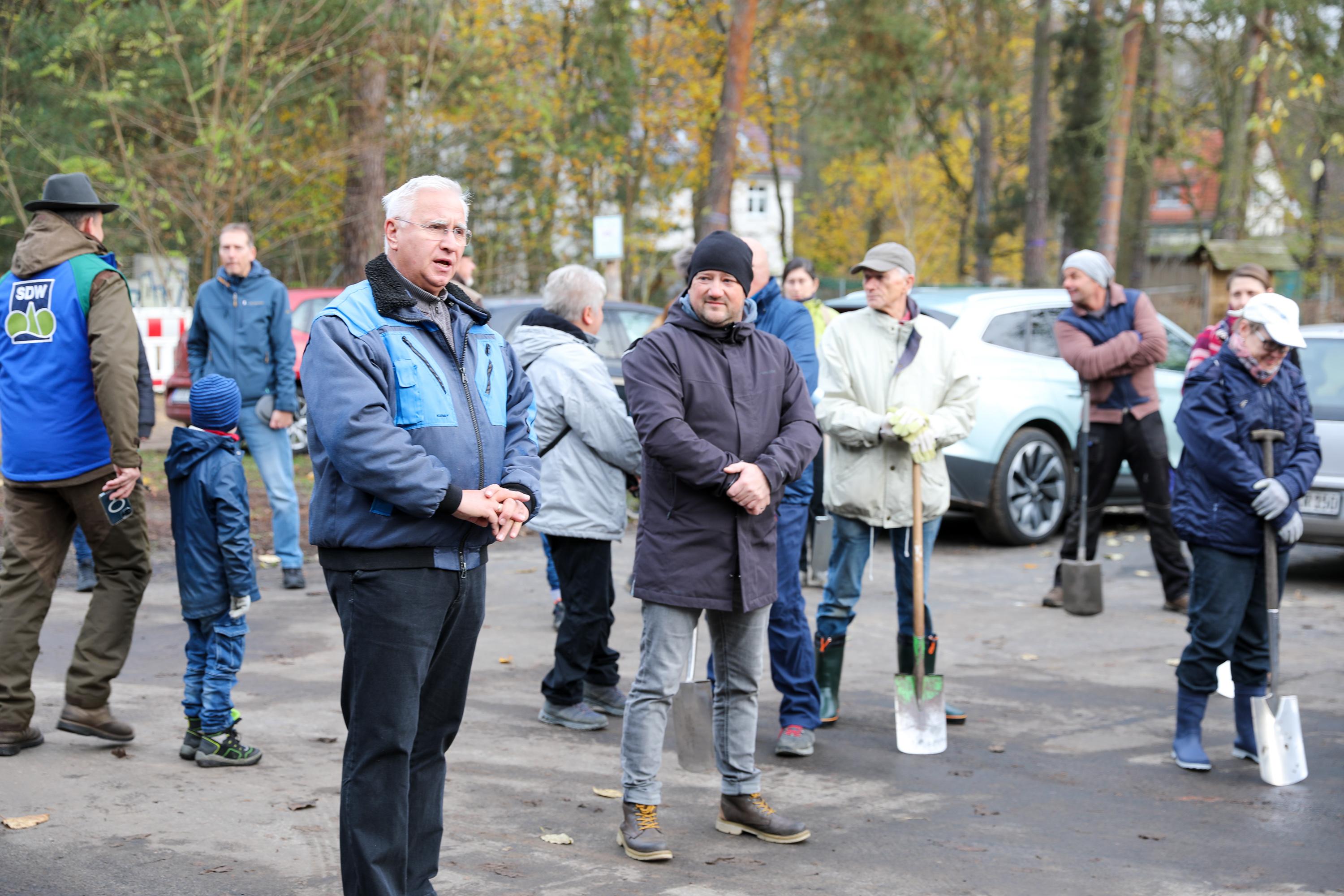 Die weiteren Novembertermine finden ganz überwiegend im Forst statt. Ob die Pflanzung von Traubeneichen im Landesbetrieb Brandenburg, Eichen und Douglasien in Forst, ob in Ludwigsfelde mitten im Wald oder als Pflanzung zwischen bestehenden Bäumen in Birkenwerder: Immer geht es darum, Diversität in den Wäldern zu fördern, die Monokulturen durch Pflanzungen in Mischwälder zu wandeln. So auch bei der Schutzgemeinschaft Deutscher Wald, bei der mit etwa 200 Personen an einem Samstagmorgen 1.000 Flatterulmen mitten zwischen hohen Bäume gesetzt werden. Oder in Schwedt, wo Mitglieder der umliegenden Kirchengemeinden eine durch den Borkenkäfer und starken Windbruch entstandene Brache mit Douglasien aufforsten. Einer Baumart, die nicht unbedingt für diversen Wald steht, die aber in der kargen, sandigen Gegend gut geeignet ist, wie der begleitende Förster den erstaunten Waldgästen erklärt.