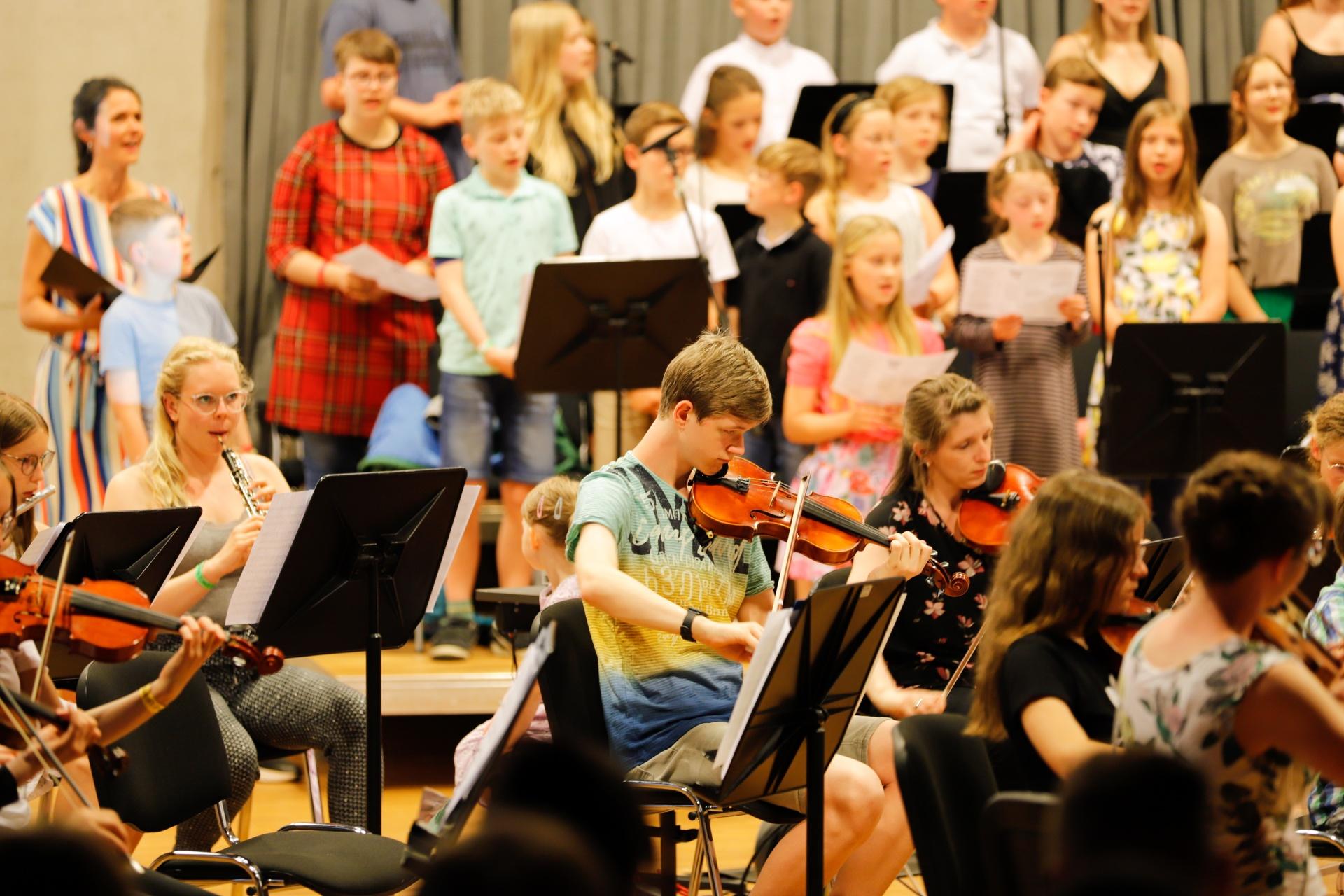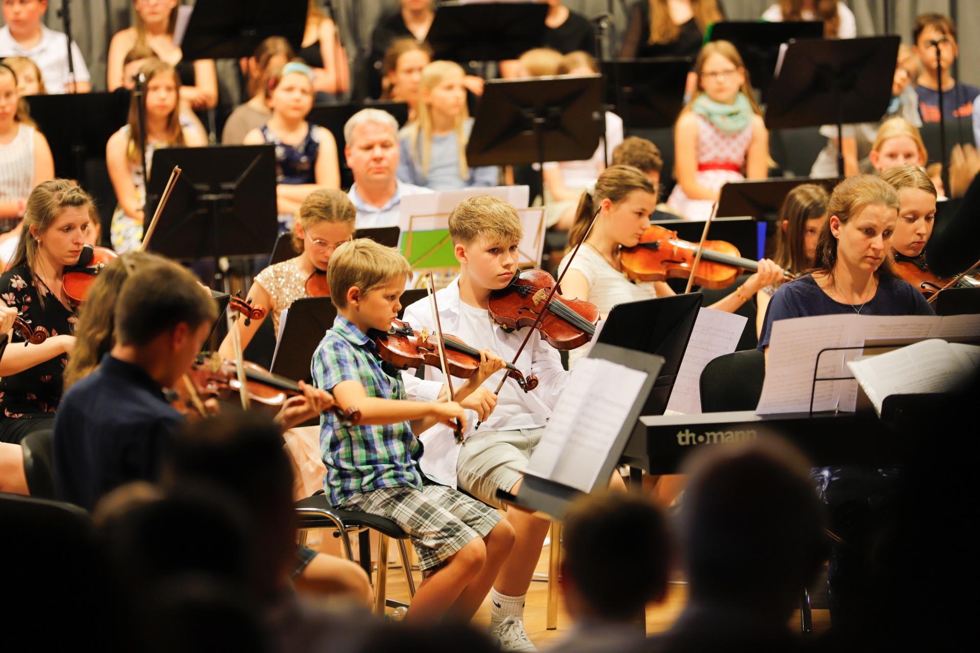Dabei zeigte sich eine Vielfalt an Beiträgen: Der Sologesang eines neunjährigen Jungen, die Klavierbegleitung von Chor und Orchester eines 14-Jährigen, eine achtjährige Cellistin im „Doppeleinsatz“ zwischen Chor und Orchester, ein 15-Jähriger, der neben diversen Schlaginstrumenten auch ein Violinkonzert vortrug, drei Kinder, die eine selbstgedichtete Strophe präsentierten, ein Cellist, der sich selbst instrumental begleitete, während er ein Gedicht aufsagte und drei Freunde, die den Chor begleiteten. Mit dabei war auch ein Erwachsener und ehemaliges Mitglied des Kindermusikwochenendes zur Unterstützung einer jungen Geigerin.