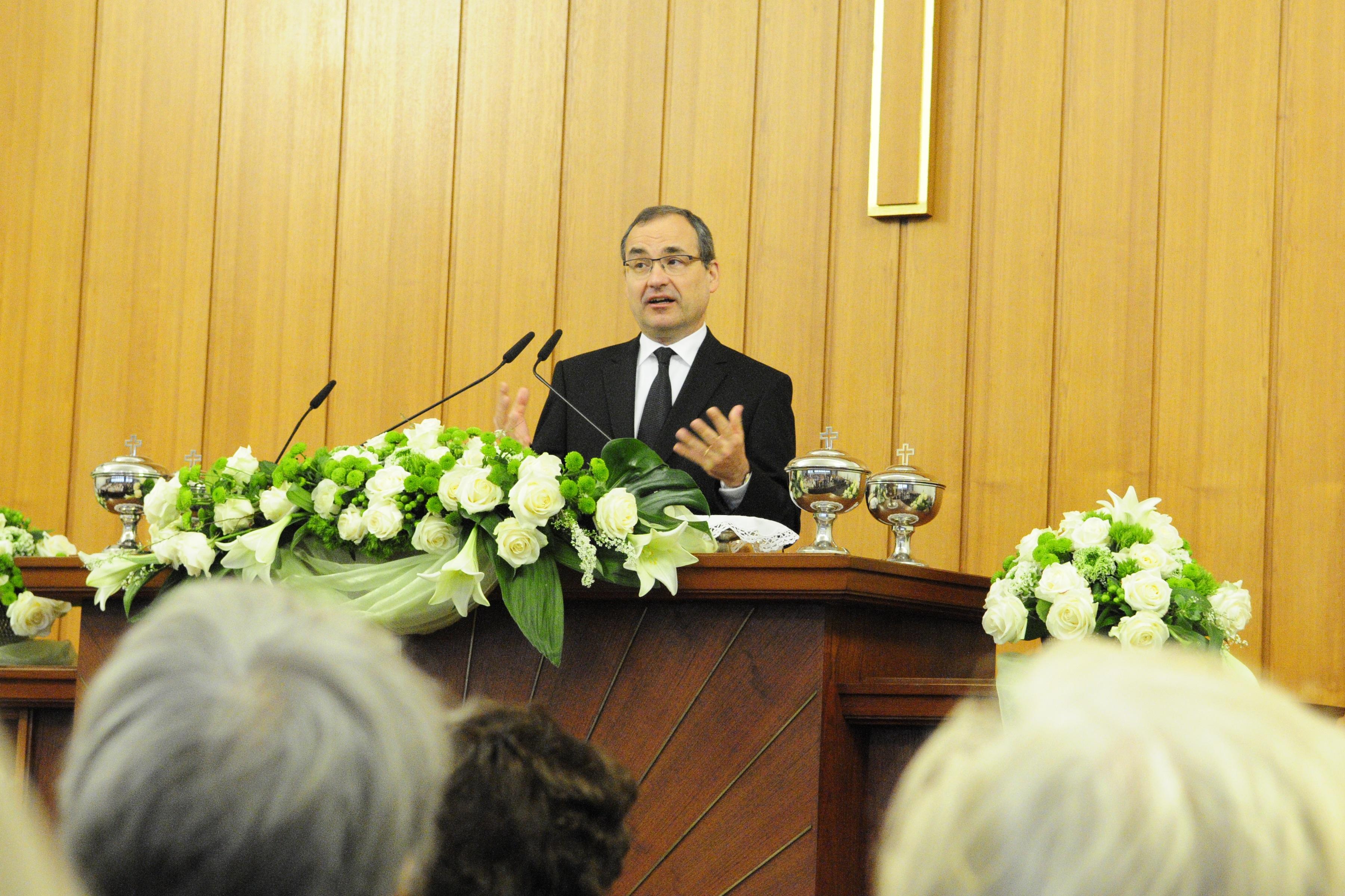 „Lasst uns den Gottesdienst für Entschlafene als ein Lob- und Dank-Gottesdienst gestalten“, rief Stammapostel Schneider die Gemeinde auf und bezog sich dabei auf das Jahresmotto „Ehre sei Gott, unserm Vater.“ Die Dankbarkeit für das Heil in Jesus Christus stand im Mittelpunkt der Predigt.